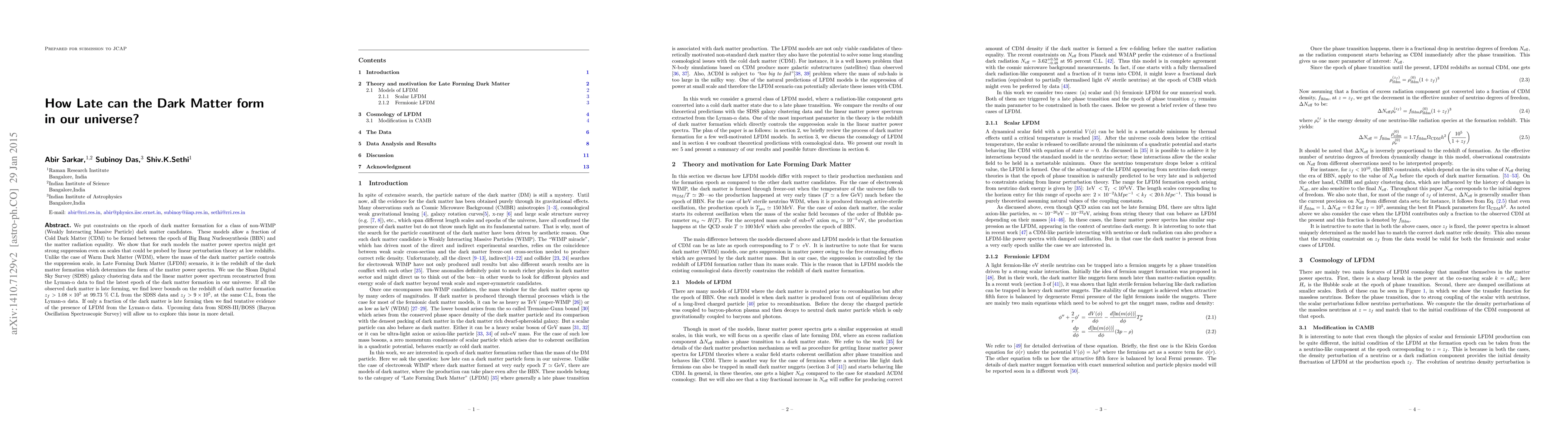 We put constraints on the epoch of dark matter formation for a class of non-WIMP (Weakly Interacting Massive Particle) dark matter candidates. These models allow a fraction of Cold Dark Matter (CDM) to be formed between the epoch of Big Bang Nucleosynthesis (BBN) and the matter radiation equality. We show that for such models the matter power spectra might get strong suppression even on scales that could be probed by linear perturbation theory at low redshifts. Unlike the case of Warm Dark Matter (WDM), where the mass of the dark matter particle controls the suppression scale, in Late Forming Dark Matter (LFDM) scenario, it is the redshift of the dark matter formation which determines the form of the matter power spectra. We use the Sloan Digital Sky Survey (SDSS) galaxy clustering data and the linear matter power spectrum reconstructed from the Lyman-$\alpha$ data to find the latest epoch of the dark matter formation in our universe. If all the observed dark matter is late forming, we find lower bounds on the redshift of dark matter formation $z_f > 1.08 \times 10^5 $ at 99.73 $\%$ C.L from the SDSS data and $z_f > 9 \times 10^5$, at the same C.L, from the Lyman-$\alpha$ data. If onlya fraction of the dark matter is late forming then we find tentative evidence of the presence of LFDM from the Lyman-$\alpha$ data. Upcoming data from SDSS-III/BOSS (Baryon Oscillation Spectroscopic Survey) will allow us to explore this issue in more detail.