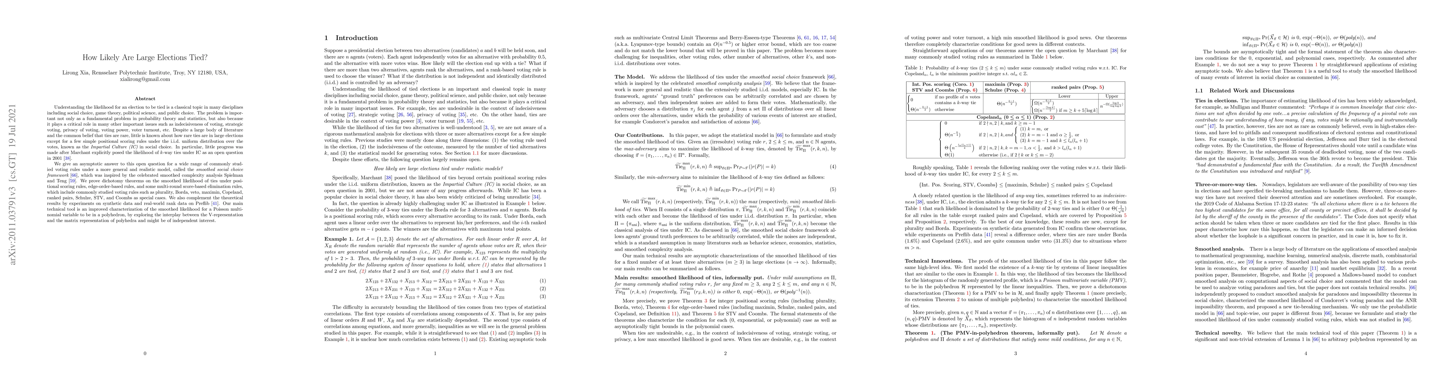 Understanding the likelihood for an election to be tied is a classical topic in many disciplines including social choice, game theory, political science, and public choice. Despite a large body of literature and the common belief that ties are rare, little is known about how rare ties are in large elections except for a few simple positional scoring rules under the i.i.d. uniform distribution over the votes, known as the Impartial Culture (IC) in social choice. In particular, little progress was made after Marchant explicitly posed the likelihood of k-way ties under IC as an open question in 2001. We give an asymptotic answer to the open question for a wide range of commonly studied voting rules under a model that is much more general and realistic than i.i.d. models (especially IC) -- the smoothed social choice framework by Xia that was inspired by the celebrated smoothed complexity analysis by Spielman and Teng. We prove dichotomy theorems on the smoothed likelihood of ties under positional scoring rules, edge-order-based rules, and some multi-round score-based elimination rules, which include commonly studied voting rules such as plurality, Borda, veto, maximin, Copeland, ranked pairs, Schulze, STV, and Coombs as special cases. We also complement the theoretical results by experiments on synthetic data and real-world rank data on Preflib. Our main technical tool is an improved dichotomous characterization on the smoothed likelihood for a Poisson multinomial variable to be in a polyhedron, which is proved by exploring the interplay between the V-representation and the matrix representation of polyhedra and might be of independent interest.