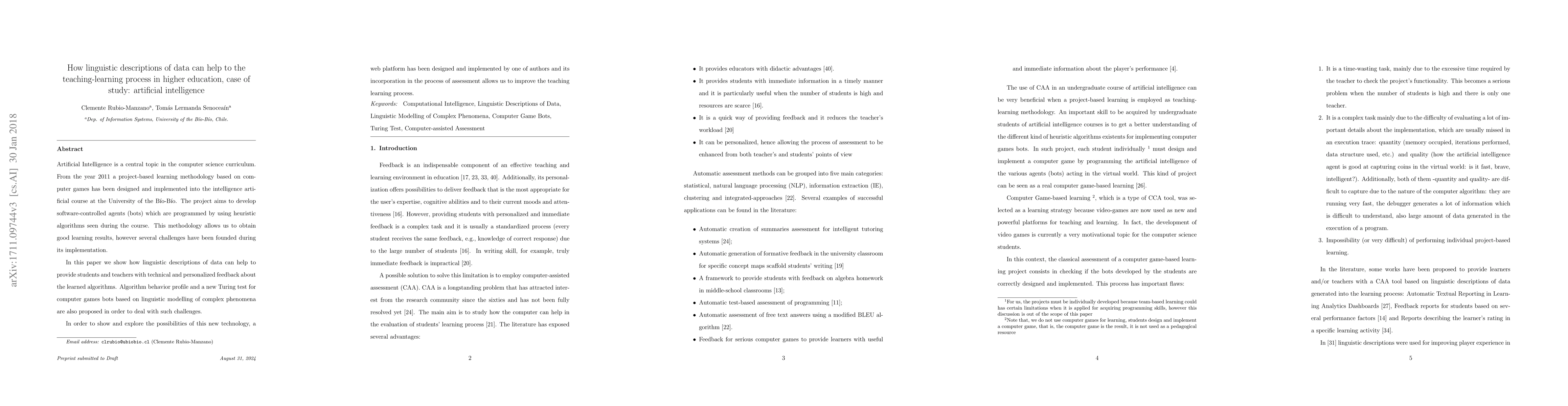 This paper explores the use of linguistic descriptions of data to enhance the teaching-learning process in higher education, specifically in an Artificial Intelligence course. It proposes a project-based learning methodology using computer games to teach heuristic algorithms, supplemented by a web platform providing technical and personalized feedback.