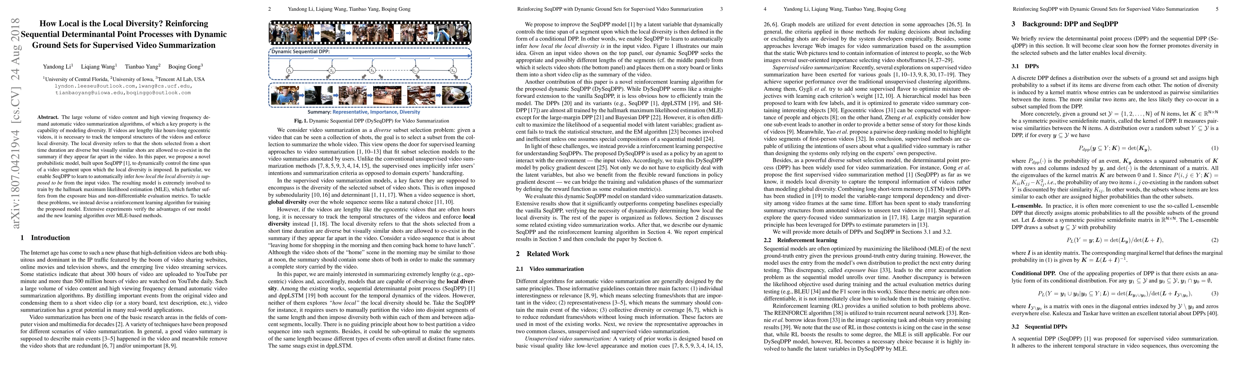 This paper proposes a novel probabilistic model based on SeqDPP to dynamically enforce local diversity in automatic video summarization, enabling the model to infer the appropriate temporal span for local diversity from the video. To address training challenges, a reinforcement learning algorithm is developed, which outperforms traditional MLE-based methods in extensive experiments.