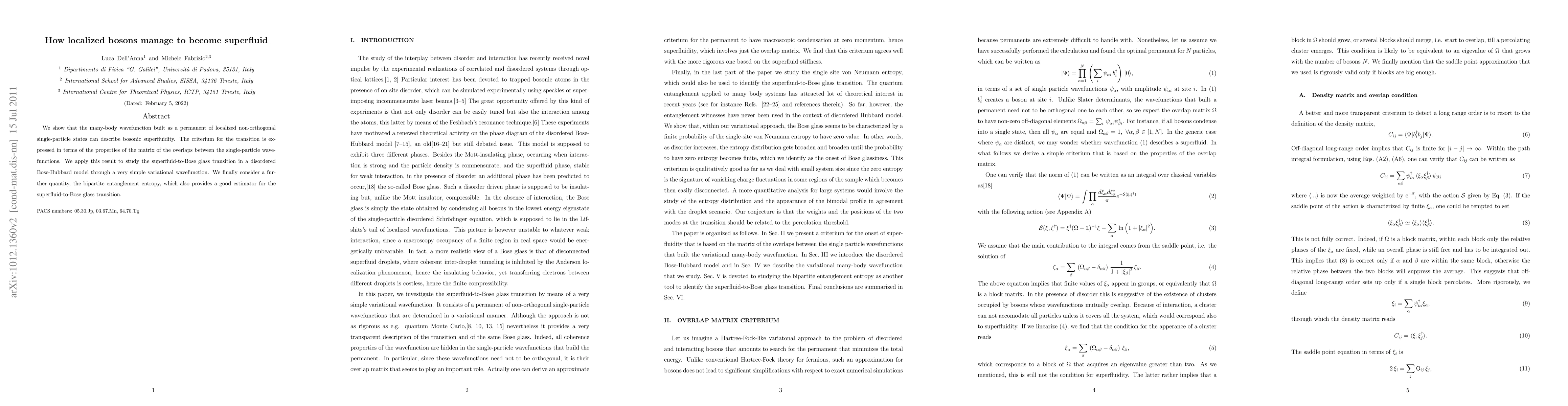 We study the superfluid-to-Bose glass transition in a disordered Bose-Hubbard model through a very simple variational wavefunction: a permanent of non-orthogonal single-particle wavefunctions that are variationally determined. The transition is identified by the behavior of the superfluid stiffness. We also introduce a less rigorous but very enlightening criterium for the transition, which is related to the overlap matrix among the single-particle wavefunctions that are used to built the permanent. We find that the two criteria agree quite well. We finally consider a further quantity, the bipartite entanglement entropy, which also provides a good estimator for the superfluid-to-Bose glass transition.