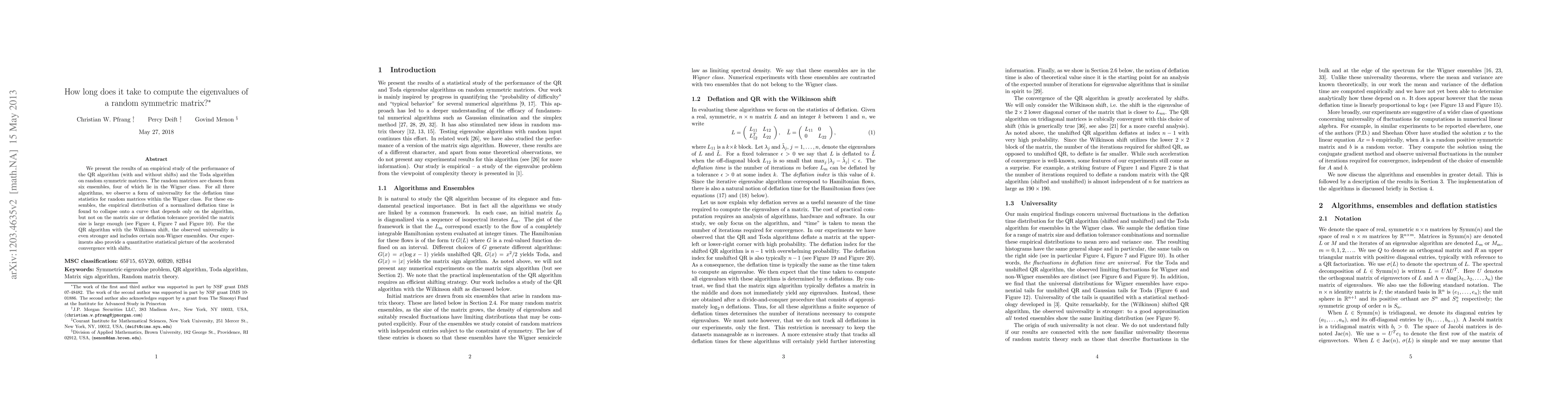 This study empirically evaluates the performance of the QR and Toda algorithms for computing eigenvalues of random symmetric matrices from six ensembles, finding universality in deflation time statistics for matrices within the Wigner class. The QR algorithm with Wilkinson shifts shows even stronger universality across different ensembles.