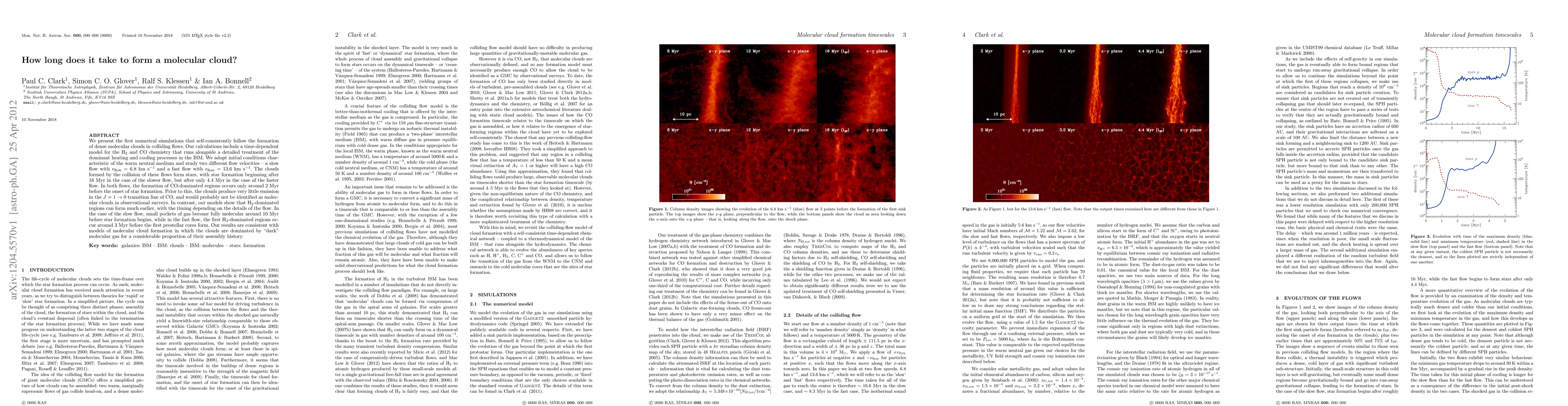 We present the first numerical simulations that self-consistently follow the formation of dense molecular clouds in colliding flows. Our calculations include a time-dependent model for the H2 and CO chemistry that runs alongside a detailed treatment of the dominant heating and cooling processes in the ISM. We adopt initial conditions characteristic of the warm neutral medium and study two different flow velocities - a slow flow with v = 6.8 km/s and a fast flow with v = 13.6 km/s. The clouds formed by the collision of these flows form stars, with star formation beginning after 16 Myr in the case of the slower flow, but after only 4.4 Myr in the case of the faster flow. In both flows, the formation of CO-dominated regions occurs only around 2 Myr before the onset of star formation. Prior to this, the clouds produce very little emission in the J = 1 -> 0 transition line of CO, and would probably not be identified as molecular clouds in observational surveys. In contrast, our models show that H2-dominated regions can form much earlier, with the timing depending on the details of the flow. In the case of the slow flow, small pockets of gas become fully molecular around 10 Myr before star formation begins, while in the fast flow, the first H2-dominated regions occur around 3 Myr before the first prestellar cores form. Our results are consistent with models of molecular cloud formation in which the clouds are dominated by "dark" molecular gas for a considerable proportion of their assembly history.