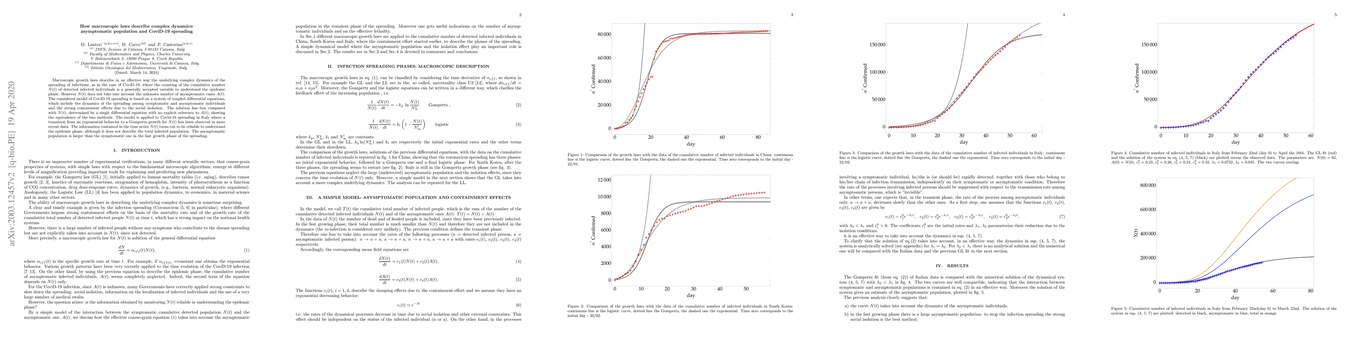 Macroscopic growth laws, solutions of mean field equations, describe in an effective way an underlying complex dynamics. They are applied to study the spreading of infections, as in the case of CoviD-19, where the counting of the cumulated number $N(t)$ of detected infected individuals is a generally accepted, coarse-grain, variable to understand the epidemic phase. However $N(t)$ does not take into account the unknown number of asymptomatic, not detected, cases $A(t)$. Therefore, the question arises if the observed time series of data of $N(t)$ is a reliable tool for monitoring the evolution of the infectious disease. We study a system of coupled differential equations which includes the dynamics of the spreading among symptomatic and asymptomatic individuals and the strong containment effects due to the social isolation. The solution is therefore compared with a macroscopic law for the population $N(t)$ coming from a single, non-linear, differential equation with no explicit reference to $A(t)$, showing the equivalence of the two methods. Indeed, $N(t)$ takes into account a more complex and detailed population dynamics which permits the evaluation of the number of asymptomatic individuals also. The model is then applied to Covid-19 spreading in Italy where a transition from an exponential behavior to a Gompertz growth for $N(t)$ has been observed in more recent data. Then the information contained in the data analysis of $N(t)$ is reliable to understand the epidemic phase, although it does not describe the total infected population. The asymptomatic population is larger than the symptomatic one in the fast growth phase of the spreading.