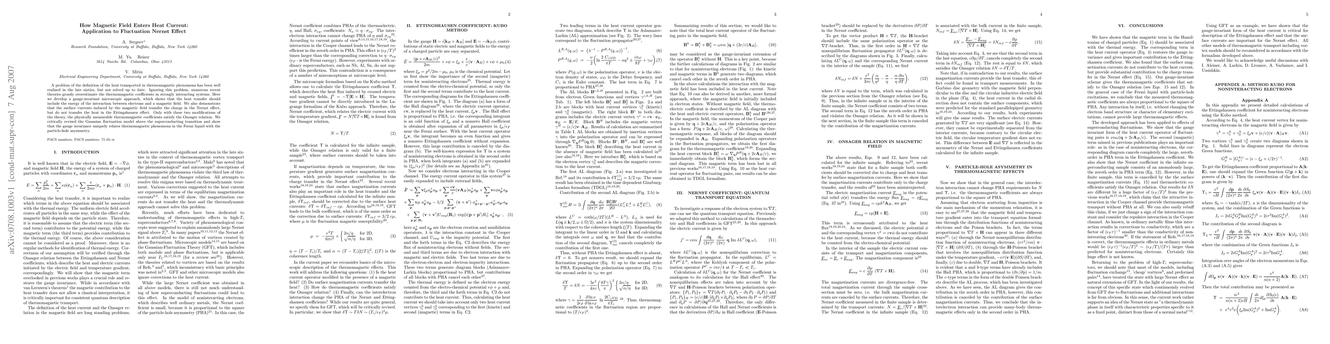 A problem of the definition of the heat transported in thermomagnetic phenomena has been well realized in the late sixties, but not solved up to date. Ignoring this problem, numerous recent theories grossly overestimate the thermomagnetic coefficients in strongly interacting systems. Here we develop a gauge-invariant microscopic approach, which shows that the heat transfer should include the energy of the interaction between electrons and a magnetic field. We also demonstrate that the surface currents induced by the magnetic field transfer the charge in the Nernst effect, but do not transfer the heat in the Ettingshausen effect. Only with these two modifications of the theory, the physically measurable thermomagnetic coefficients satisfy the Onsager relation. We critically revised the Gaussian fluctuation model above the superconducting transition and show that the gauge invariance uniquely relates thermomagnetic phenomena in the Fermi liquid with the particle-hole asymmetry.