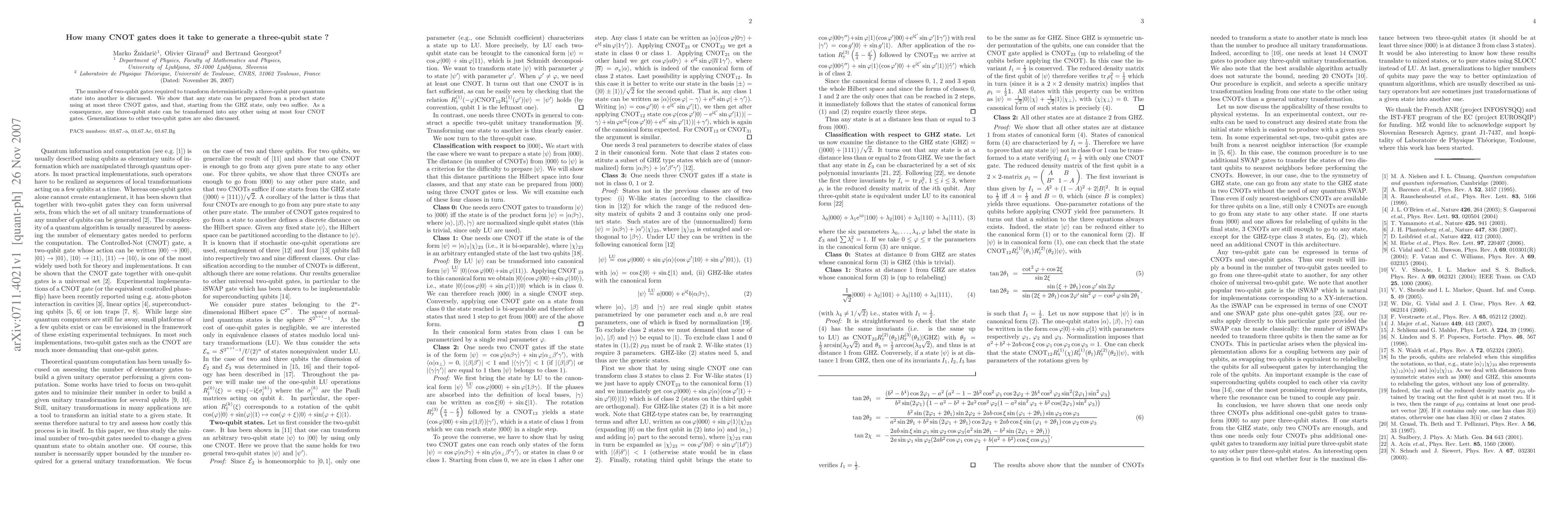 Summary: This research demonstrates that any three-qubit pure quantum state can be transformed into another using at most three CNOT gates, with only two needed starting from the GHZ state, and concludes that a maximum of four CNOT gates suffices in general. The study also explores implications for other two-qubit gates.