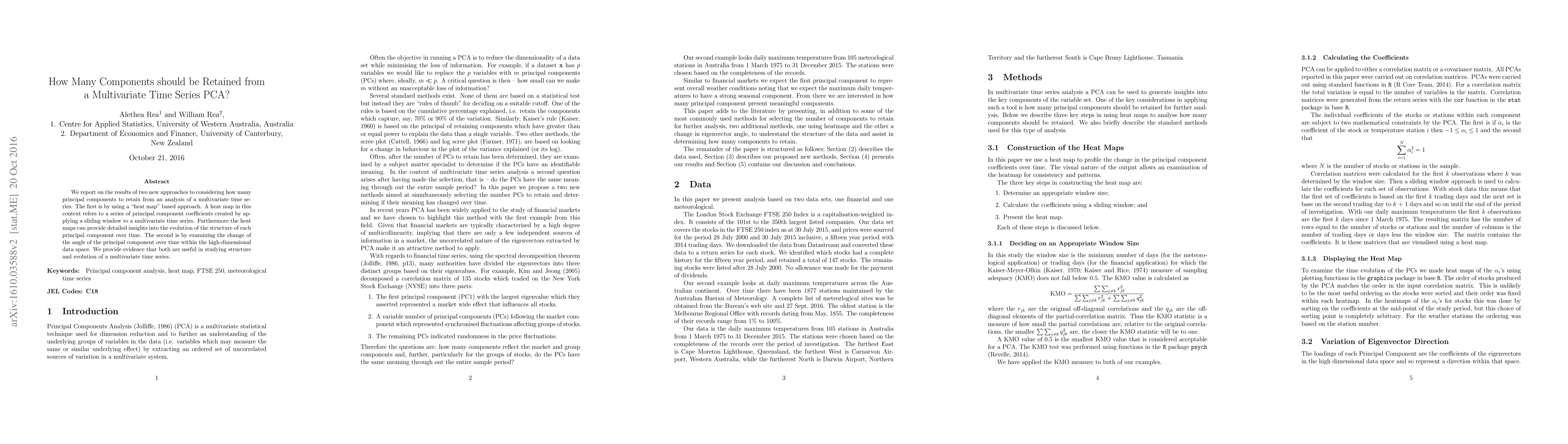 We report on the results of two new approaches to considering how many principal components to retain from an analysis of a multivariate time series. The first is by using a "heat map" based approach. A heat map in this context refers to a series of principal component coefficients created by applying a sliding window to a multivariate time series. Furthermore the heat maps can provide detailed insights into the evolution of the structure of each principal component over time. The second is by examining the change of the angle of the principal component over time within the high-dimensional data space. We provide evidence that both are useful in studying structure and evolution of a multivariate time series.