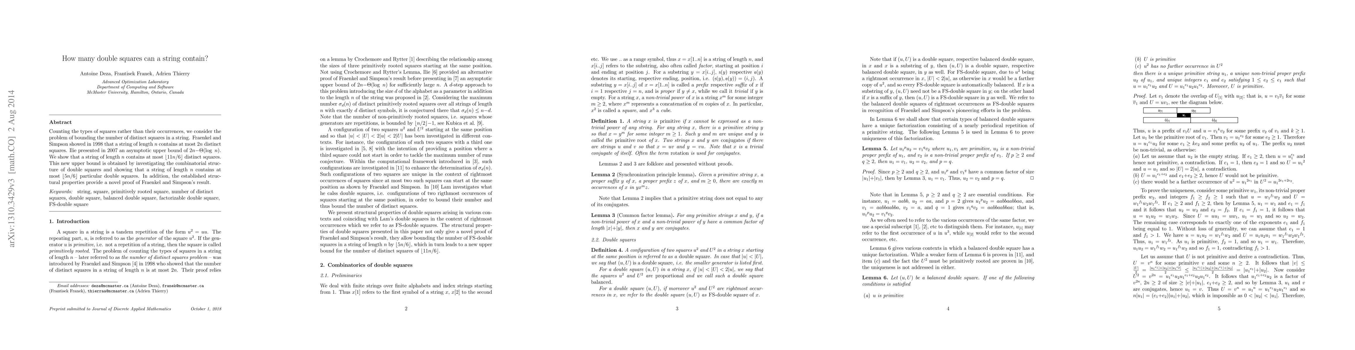 This paper establishes a new upper bound on the number of distinct squares in a string of length n, showing that it contains at most 5n/3 distinct squares. It also demonstrates that a string of length n contains at most 2n/3 double squares, providing a novel proof of Fraenkel and Simpson's earlier result.