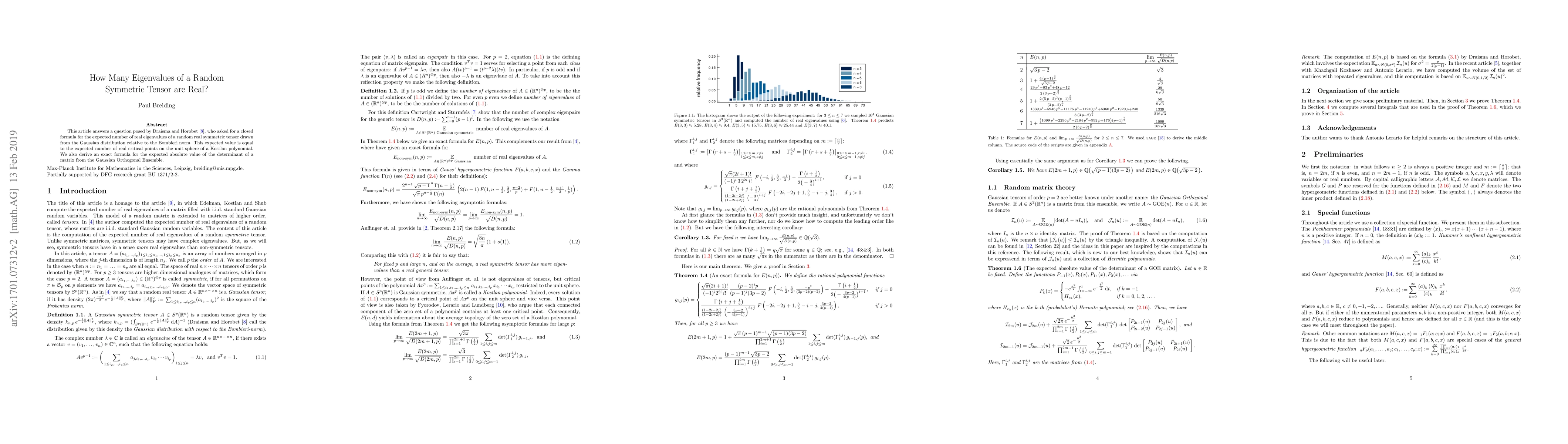 This paper provides a closed formula for the expected number of real eigenvalues of a random symmetric tensor from the Gaussian distribution, linking it to the expected number of real critical points on the unit sphere of a Kostlan polynomial. Additionally, it derives an exact formula for the expected absolute value of the determinant of a matrix from the Gaussian Orthogonal Ensemble.