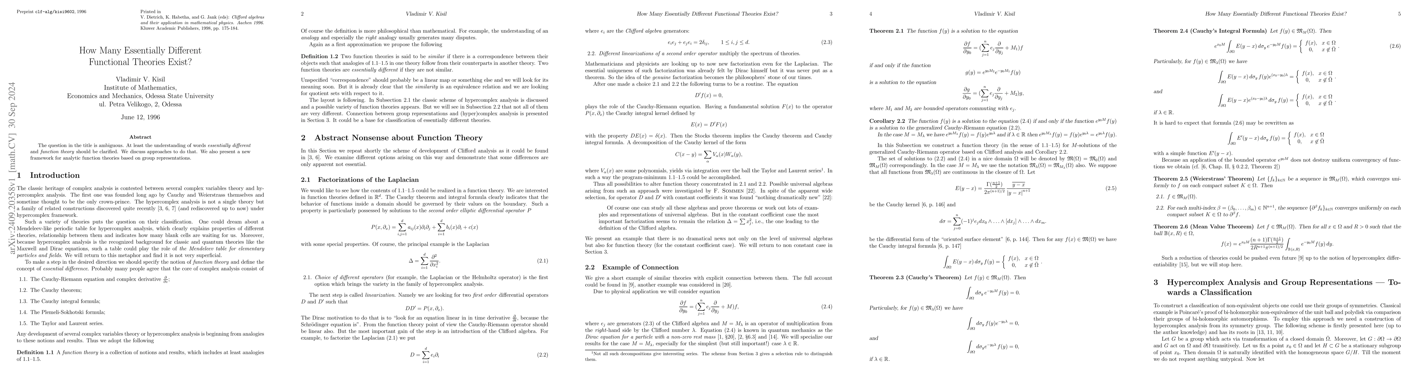Title: How Many Essentially Different Functional Theories Exist? Summary: This paper explores the ambiguity in defining "essentially different" functional theories and proposes a new framework based on group representations to categorize analytic function theories. The authors aim to clarify the understanding of these concepts and provide a structured approach to analyzing functional theories.