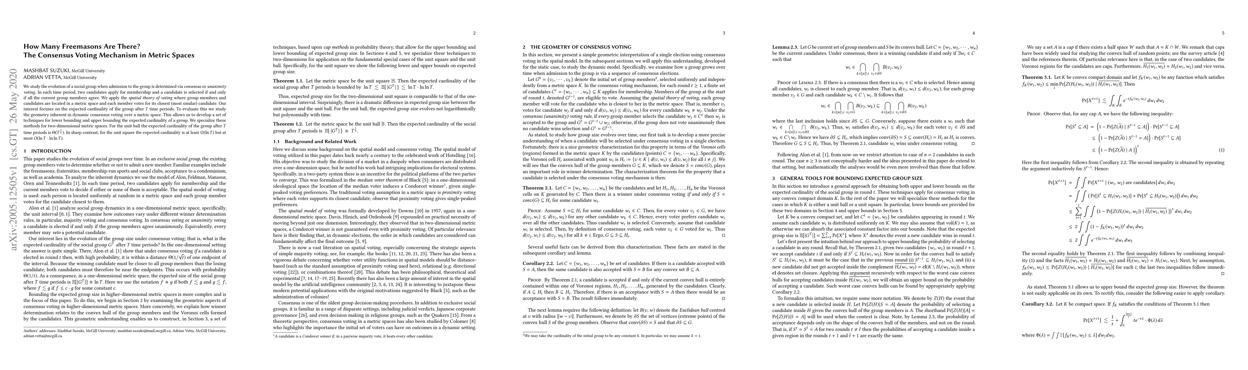 A study on the growth of a social group using consensus voting in metric spaces shows that expected membership size grows at different rates depending on the space geometry, ranging from O(T^1/8) for unit ball to ω(ln T) and O(ln T σ ln T) for unit square.