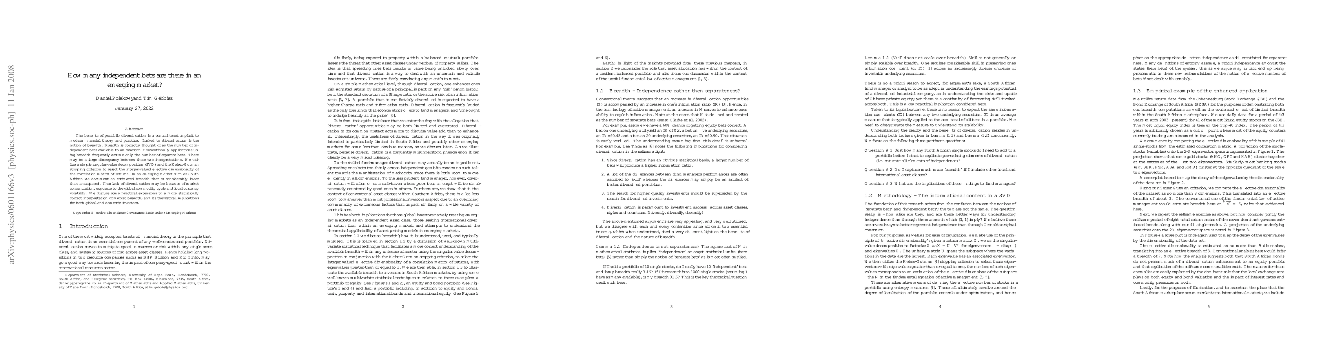 The benefits of portfolio diversification is a central tenet implicit to modern financial theory and practice. Linked to diversification is the notion of breadth. Breadth is correctly thought of as the number of in- dependent bets available to an investor. Conventionally applications us- ing breadth frequently assume only the number of separate bets. There may be a large discrepancy between these two interpretations. We uti- lize a simple singular-value decomposition (SVD) and the Keiser-Gutman stopping criterion to select the integer-valued effective dimensionality of the correlation matrix of returns. In an emerging market such as South African we document an estimated breadth that is considerably lower than anticipated. This lack of diversification may be because of market concentration, exposure to the global commodity cycle and local currency volatility. We discuss some practical extensions to a more statistically correct interpretation of market breadth, and its theoretical implications for both global and domestic investors.