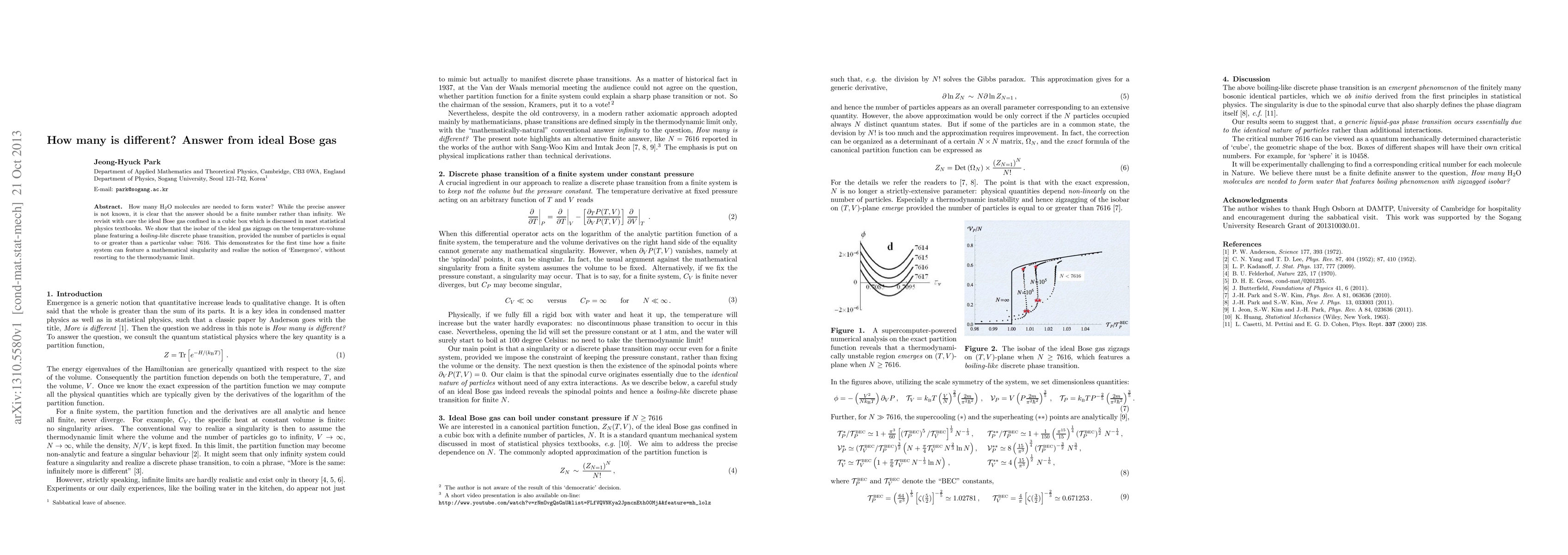 How many $\mathrm{H_{2}O}$ molecules are needed to form water? While the precise answer is not known, it is clear that the answer should be a finite number rather than infinity. We revisit with care the ideal Bose gas confined in a cubic box which is discussed in most statistical physics textbooks. We show that the isobar of the ideal gas zigzags on the temperature-volume plane featuring a `boiling-like' discrete phase transition, provided the number of particles is equal to or greater than a particular value: 7616. This demonstrates for the first time how a finite system can feature a mathematical singularity and realize the notion of `Emergence', without resorting to the thermodynamic limit.