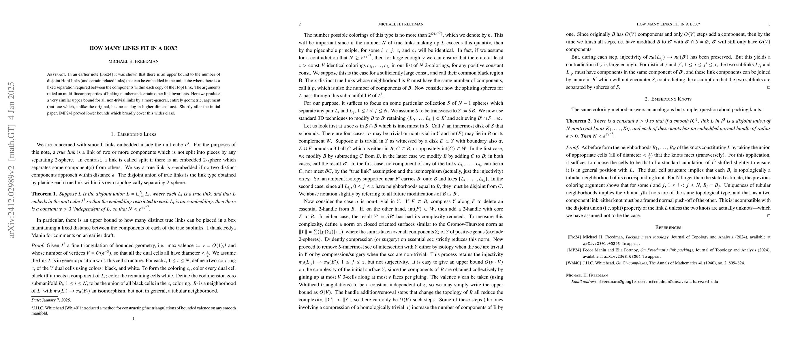 Summary: This paper establishes a geometric upper bound for the number of non-trivial links that can fit within a unit cube, while previous work had only established bounds for disjoint Hopf links. Subsequent research confirmed these upper bounds as effective lower bounds in the specific context of the cube.