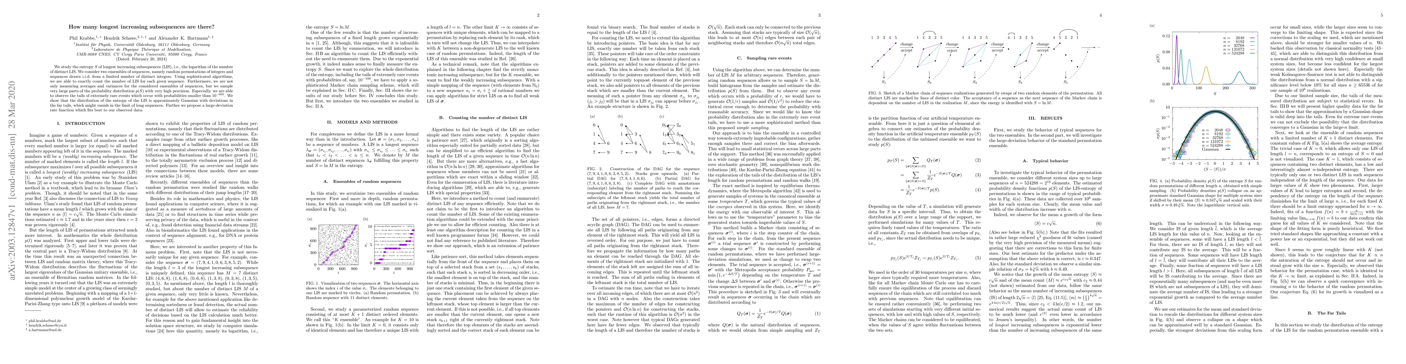 Researchers studied the distribution of longest increasing subsequences in sequences of integers, finding it approximates a Gaussian distribution with rare events that follow a large-deviation rate function.