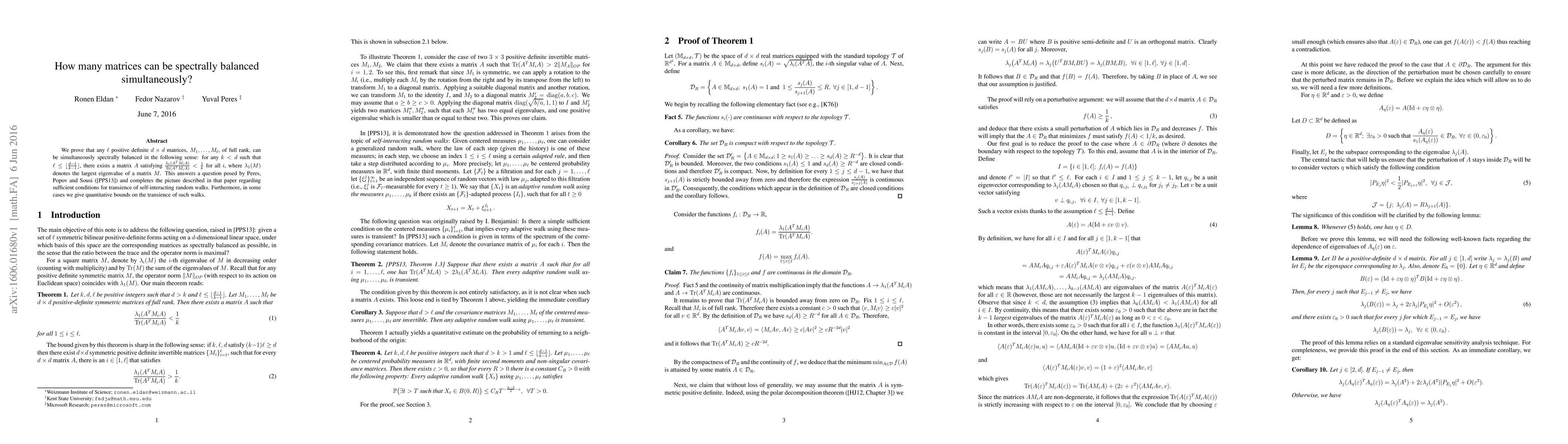 A research paper proves that multiple positive definite matrices can be spectrally balanced simultaneously within certain conditions, with implications for the transience of self-interacting random walks.