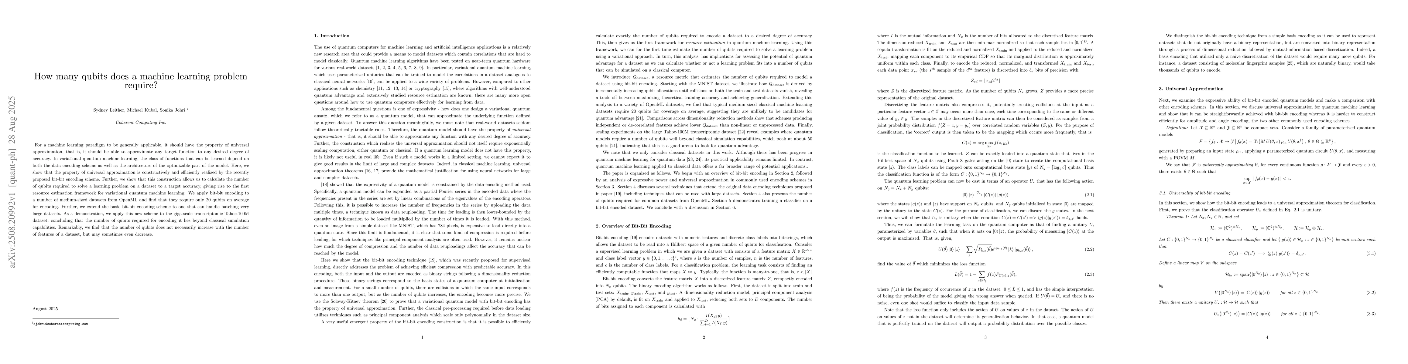 For a machine learning paradigm to be generally applicable, it should have the property of universal approximation, that is, it should be able to approximate any target function to any desired degree of accuracy. In variational quantum machine learning, the class of functions that can be learned depend on both the data encoding scheme as well as the architecture of the optimizable part of the model. Here, we show that the property of universal approximation is constructively and efficiently realized by the recently proposed bit-bit encoding scheme. Further, we show that this construction allows us to calculate the number of qubits required to solve a learning problem on a dataset to a target accuracy, giving rise to the first resource estimation framework for variational quantum machine learning. We apply bit-bit encoding to a number of medium-sized datasets from OpenML and find that they require only $20$ qubits on average for encoding. Further, we extend the basic bit-bit encoding scheme to one that can handle batching very large datasets. As a demonstration, we apply this new scheme to the giga-scale transcriptomic Tahoe-100M dataset, concluding that the number of qubits required for encoding it lies beyond classical simulation capabilities. Remarkably, we find that the number of qubits does not necessarily increase with the number of features of a dataset, but may sometimes even decrease.