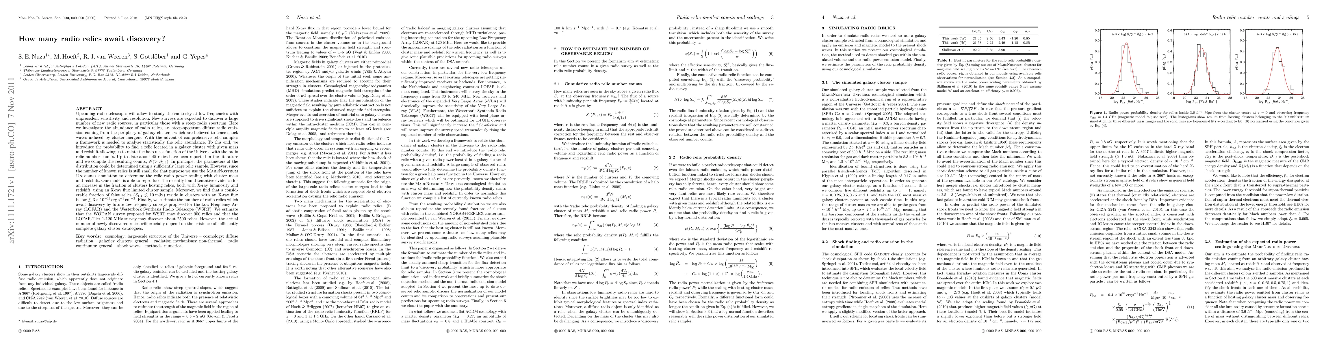 Upcoming radio telescopes will allow to study the radio sky at low frequencies with unprecedent sensitivity and resolution. New surveys are expected to discover a large number of new radio sources. Here we investigate the abundance of radio relics, i.e. steep-spectrum diffuse radio emission coming from the periphery of galaxy clusters, which are believed to trace shock waves induced by cluster mergers. With the advent of comprehensive relic samples a framework is needed to analyze statistically the relic abundance. To this end, we introduce the probability to find a relic located in a galaxy cluster with given mass and redshift allowing us to relate the halo mass function of the Universe with the radio relic number counts. Up to date about 45 relics have been reported and we compile the resulting counts, N(>S_1.4). In principle, the parameters of the distribution could be determined using a sufficiently large relic sample. However, since the number of known relics is still small for that purpose we use the MareNostrum Universe simulation to determine the relic radio power scaling with cluster mass and redshift. Our model is able to reproduce the recently found tentative evidence for an increase in the fraction of clusters hosting relics, both with X-ray luminosity and redshift, using an X-ray flux limited cluster sample. Moreover, we find that a considerable fraction of faint relics (S_1.4 < ~10 mJy) reside in clusters with an X-ray flux below ~3e-12 erg/s/cm^2. Finally, we estimate the number of radio relics which await discovery by future low frequency surveys proposed for LOFAR and WSRT. We estimate that the WODAN survey proposed for WSRT may discover 900 relics and that the LOFAR-Tier 1-120 MHz survey may discover about 2500 relics. However, the actual number of newly discovered relics will crucially depend on the existence of sufficiently complete galaxy cluster catalogues.