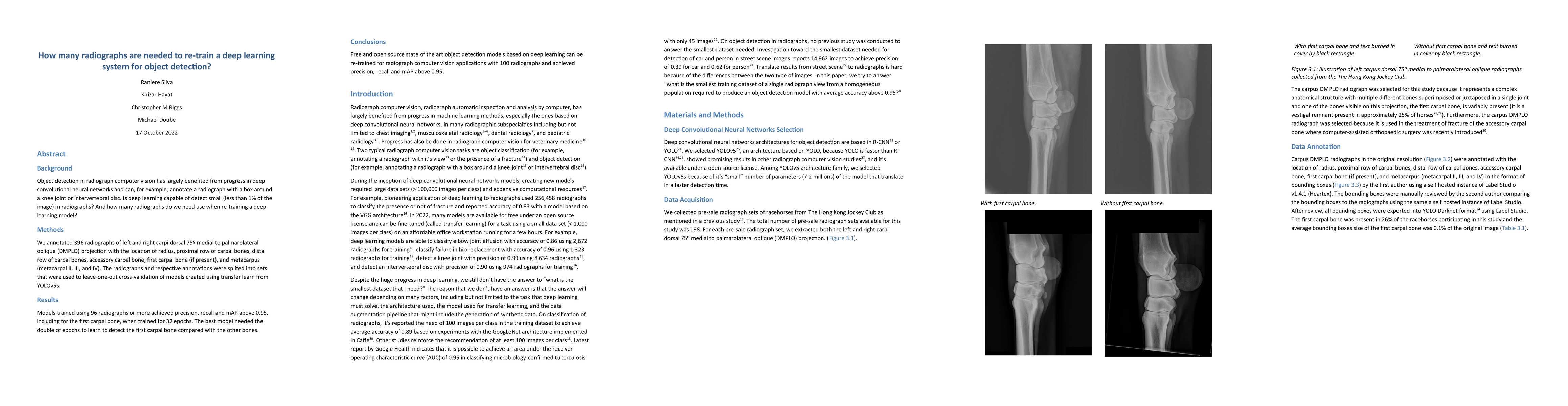 Background: Object detection in radiograph computer vision has largely benefited from progress in deep convolutional neural networks and can, for example, annotate a radiograph with a box around a knee joint or intervertebral disc. Is deep learning capable of detect small (less than 1% of the image) in radiographs? And how many radiographs do we need use when re-training a deep learning model? Methods: We annotated 396 radiographs of left and right carpi dorsal 75 medial to palmarolateral oblique (DMPLO) projection with the location of radius, proximal row of carpal bones, distal row of carpal bones, accessory carpal bone, first carpal bone (if present), and metacarpus (metacarpal II, III, and IV). The radiographs and respective annotations were splited into sets that were used to leave-one-out cross-validation of models created using transfer learn from YOLOv5s. Results: Models trained using 96 radiographs or more achieved precision, recall and mAP above 0.95, including for the first carpal bone, when trained for 32 epochs. The best model needed the double of epochs to learn to detect the first carpal bone compared with the other bones. Conclusions: Free and open source state of the art object detection models based on deep learning can be re-trained for radiograph computer vision applications with 100 radiographs and achieved precision, recall and mAP above 0.95.