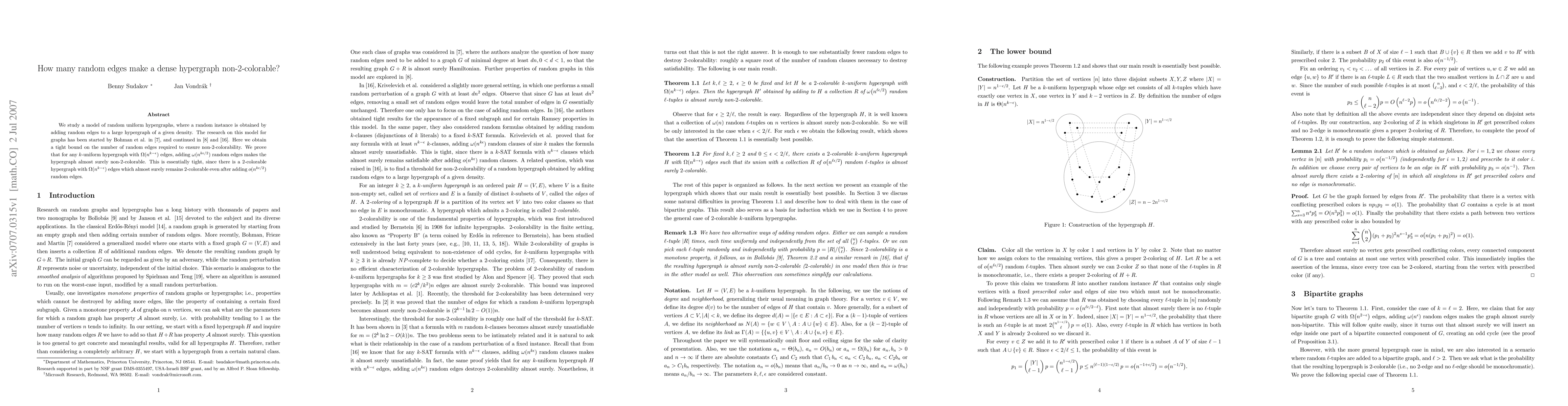 The paper presents a tight bound on the number of random edges required to ensure non-2-colorability in dense random uniform hypergraphs, along with a detailed proof strategy using induction and lemmas.