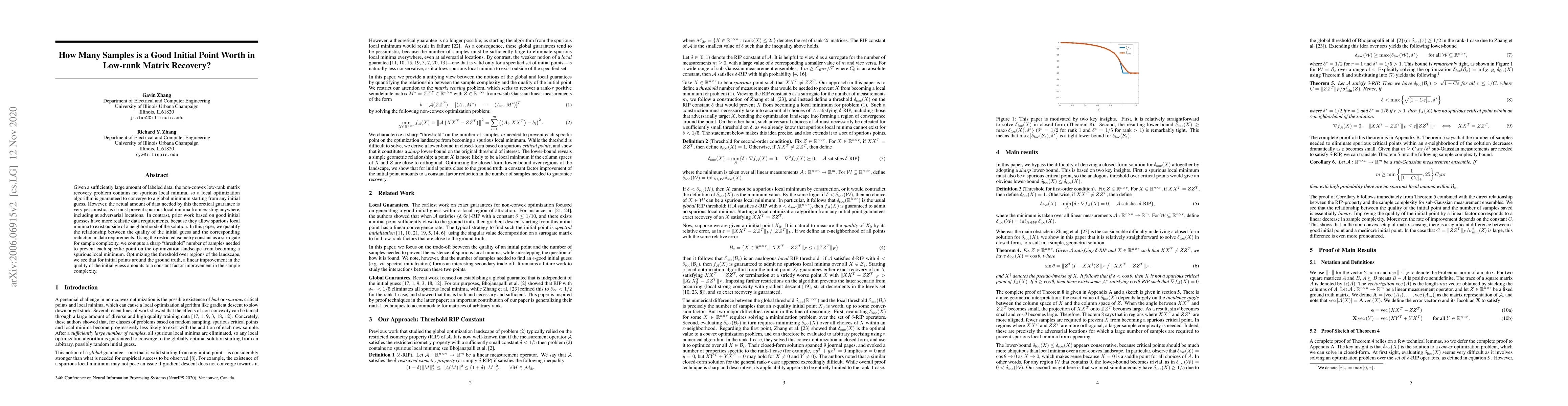 Given a sufficiently large amount of labeled data, the non-convex low-rank matrix recovery problem contains no spurious local minima, so a local optimization algorithm is guaranteed to converge to a global minimum starting from any initial guess. However, the actual amount of data needed by this theoretical guarantee is very pessimistic, as it must prevent spurious local minima from existing anywhere, including at adversarial locations. In contrast, prior work based on good initial guesses have more realistic data requirements, because they allow spurious local minima to exist outside of a neighborhood of the solution. In this paper, we quantify the relationship between the quality of the initial guess and the corresponding reduction in data requirements. Using the restricted isometry constant as a surrogate for sample complexity, we compute a sharp threshold number of samples needed to prevent each specific point on the optimization landscape from becoming a spurious local minimum. Optimizing the threshold over regions of the landscape, we see that for initial points around the ground truth, a linear improvement in the quality of the initial guess amounts to a constant factor improvement in the sample complexity.