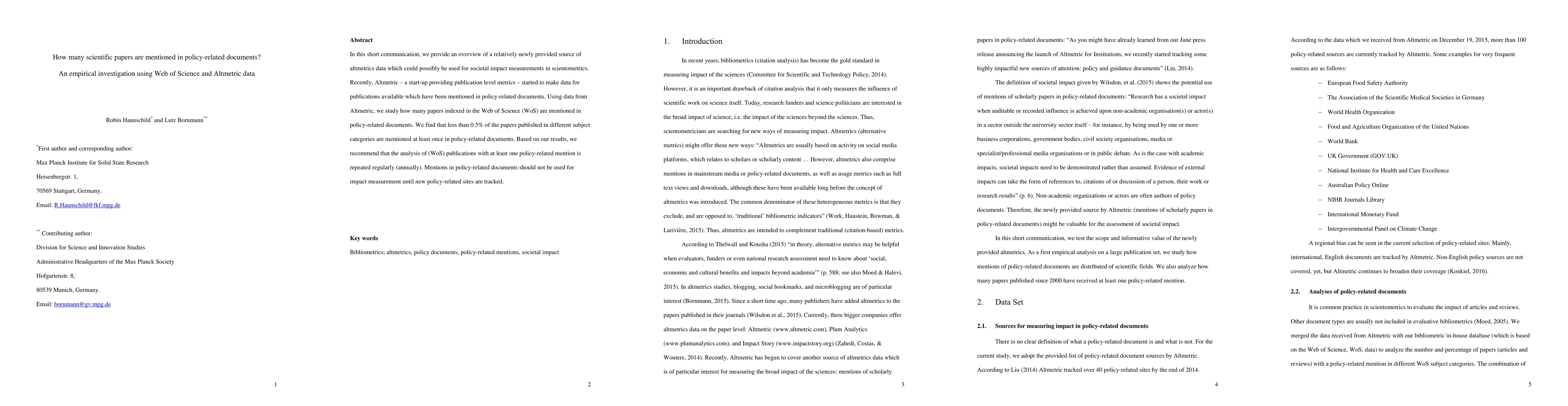 This study investigates the frequency of scientific papers indexed in Web of Science being cited in policy-related documents using Altmetric data, finding that less than 0.5% of papers receive such mentions. The authors recommend regular analysis of these mentions and caution against using them for impact measurement until broader policy-related sites are tracked.