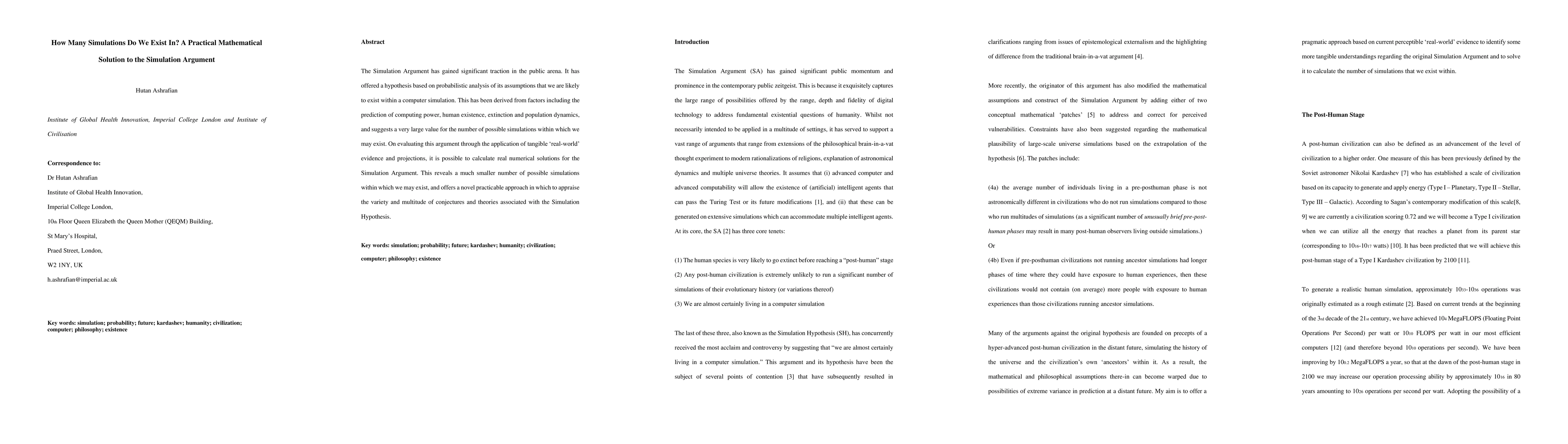 The Simulation Argument has gained significant traction in the public arena. It has offered a hypothesis based on probabilistic analysis of its assumptions that we are likely to exist within a computer simulation. This has been derived from factors including the prediction of computing power, human existence, extinction and population dynamics, and suggests a very large value for the number of possible simulations within which we may exist. On evaluating this argument through the application of tangible real-world evidence and projections, it is possible to calculate real numerical solutions for the Simulation Argument. This reveals a much smaller number of possible simulations within which we may exist, and offers a novel practicable approach in which to appraise the variety and multitude of conjectures and theories associated with the Simulation Hypothesis.