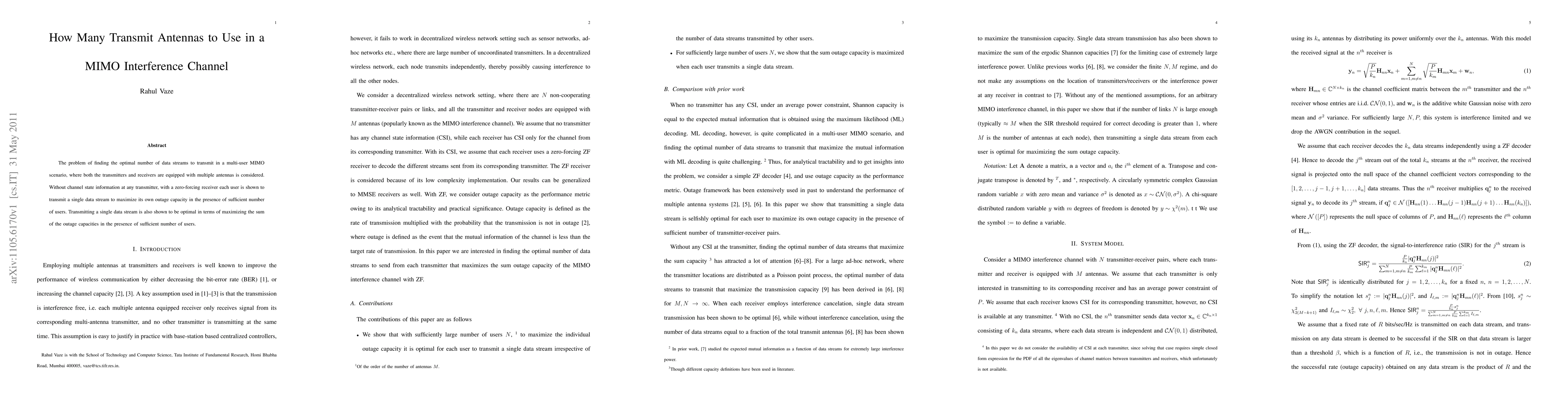 The problem of finding the optimal number of data streams to transmit in a multi-user MIMO scenario, where both the transmitters and receivers are equipped with multiple antennas is considered. Without channel state information at any transmitter, with a zero-forcing receiver each user is shown to transmit a single data stream to maximize its own outage capacity in the presence of sufficient number of users. Transmitting a single data stream is also shown to be optimal in terms of maximizing the sum of the outage capacities in the presence of sufficient number of users.