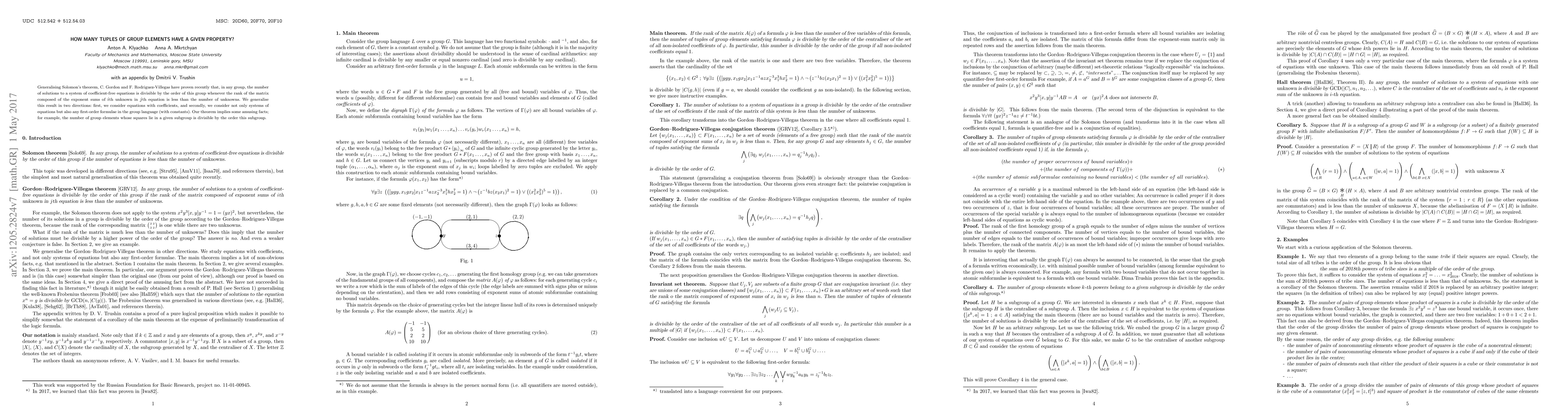 The paper generalizes a theorem on systems of equations in group theory to include first-order formulas with coefficients and subgroup properties, showing that the number of solutions is divisible by the group order under certain conditions.