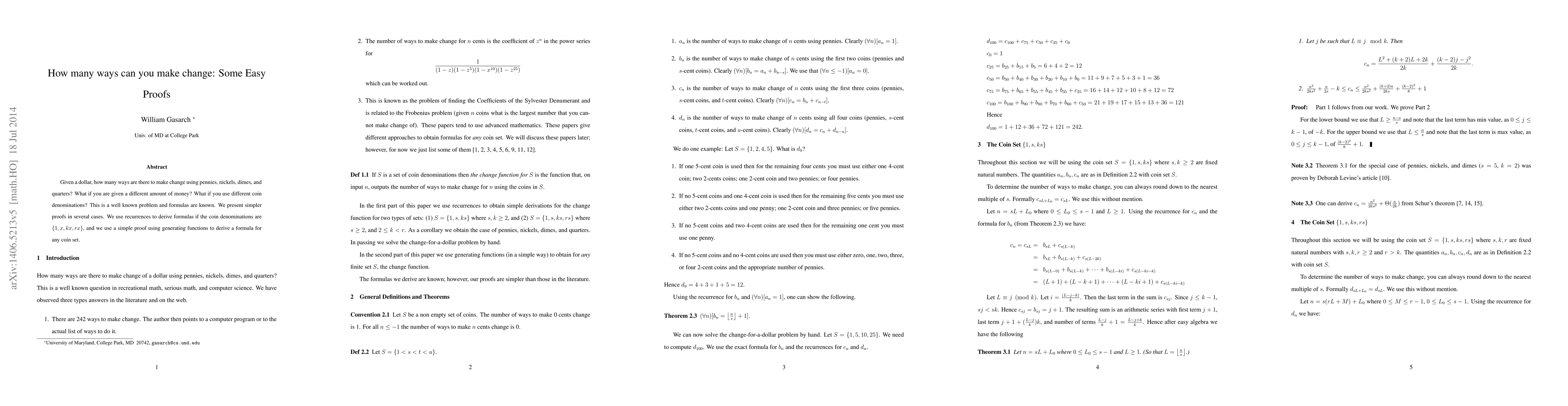 This paper explores the problem of counting change combinations for different amounts of money using various coin denominations. It provides simpler proofs using recurrences and generating functions to derive formulas for specific and general coin sets.
