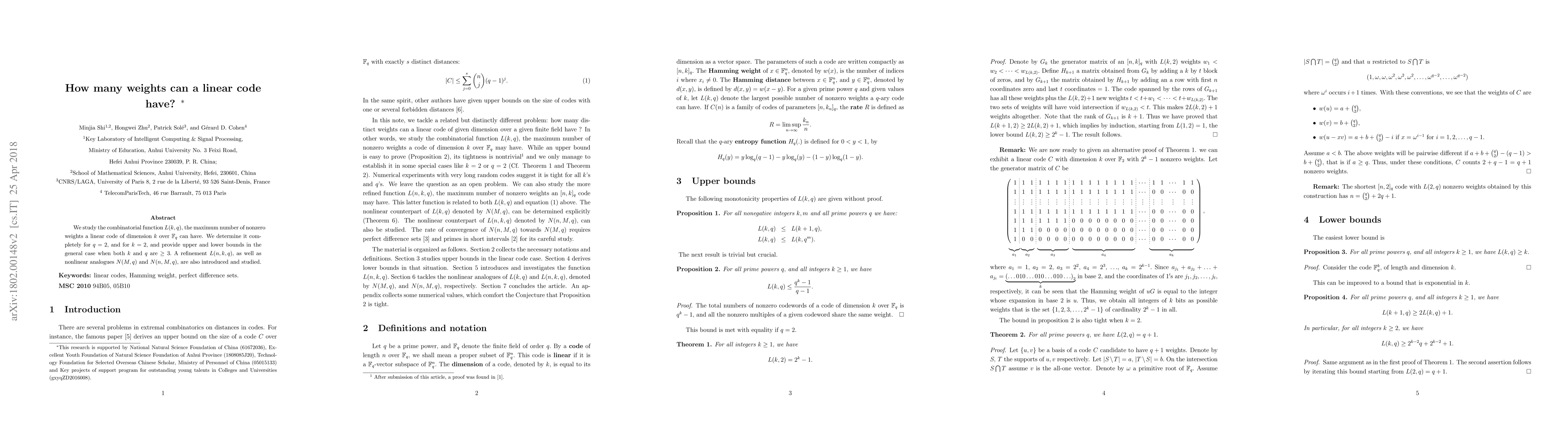 Researchers studied how many weights a linear code can have, determining complete solutions for q=2 and k=2, and providing bounds for higher dimensions.
