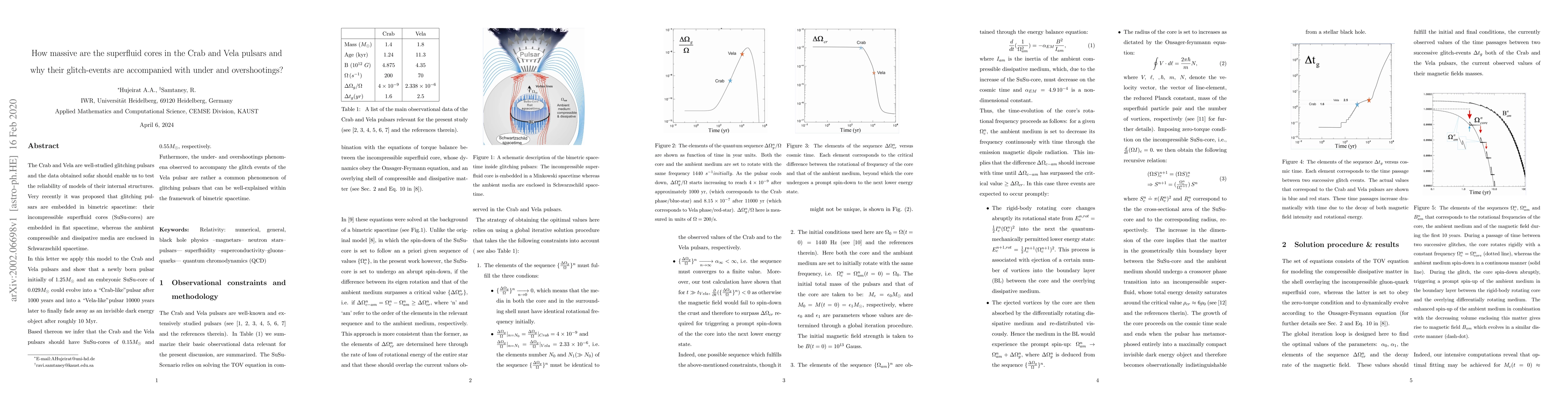 The Crab and Vela are well-studied glitching pulsars and the data obtained sofar should enable us to test the reliability of models of their internal structures. Very recently it was proposed that glitching pulsars are embedded in bimetric spacetime: their incompressible superfluid cores (SuSu-cores) are embedded in flat spacetime, whereas the ambient compressible and dissipative media are enclosed in Schwarzschild spacetime. In this letter we apply this model to the Crab and Vela pulsars and show that a newly born pulsar initially of $1.25\text{M}_{\odot}$ and an embryonic SuSu-core of $0.029\text{M}_{\odot}$ could evolve into a \ARZL{Crab-like}\ARZR pulsar after 1000 years and into a \ARZL{Vela-like}\ARZR pulsar 10000 years later to finally fade away as an invisible dark energy object after roughly 10 Myr. Based thereon we infer that the Crab and the Vela pulsars should have SuSu-cores of $0.15\text{M}_{\odot}$ and $0.55\text{M}_{\odot}$, respectively. Futhermore, the under- and overshootings phenomena observed to accompany the glitch events of the Vela pulsar are rather a common phenomenon of glitching pulsars that can be well-explained within the framework of bimetric spacetime.