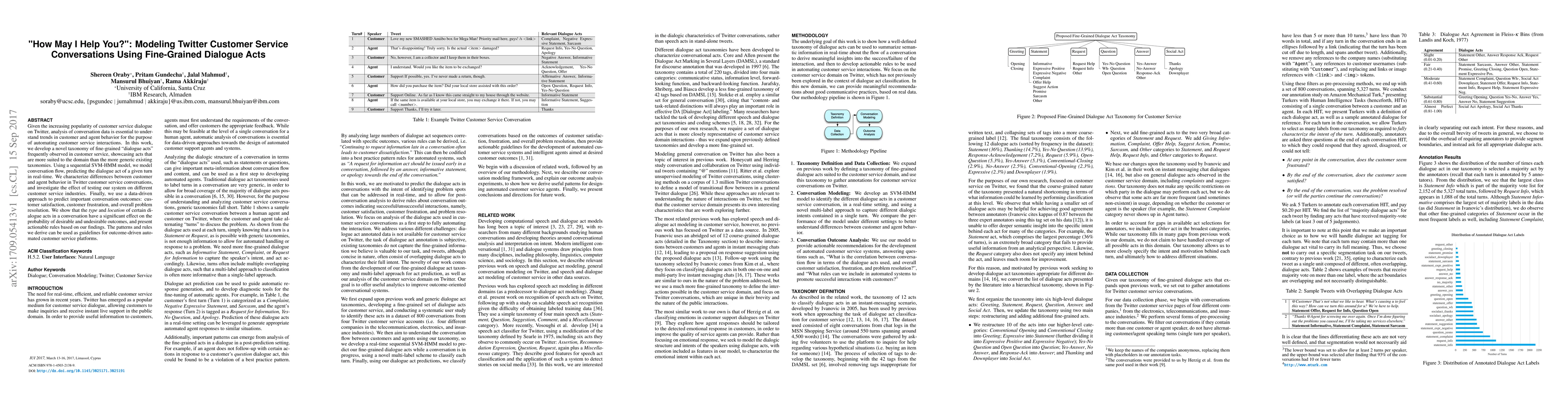 This paper develops a fine-grained taxonomy of dialogue acts for Twitter customer service conversations and uses a sequential SVM-HMM model to predict dialogue acts in real-time. It identifies significant patterns affecting customer satisfaction and problem resolution, providing actionable insights for automated customer service systems.