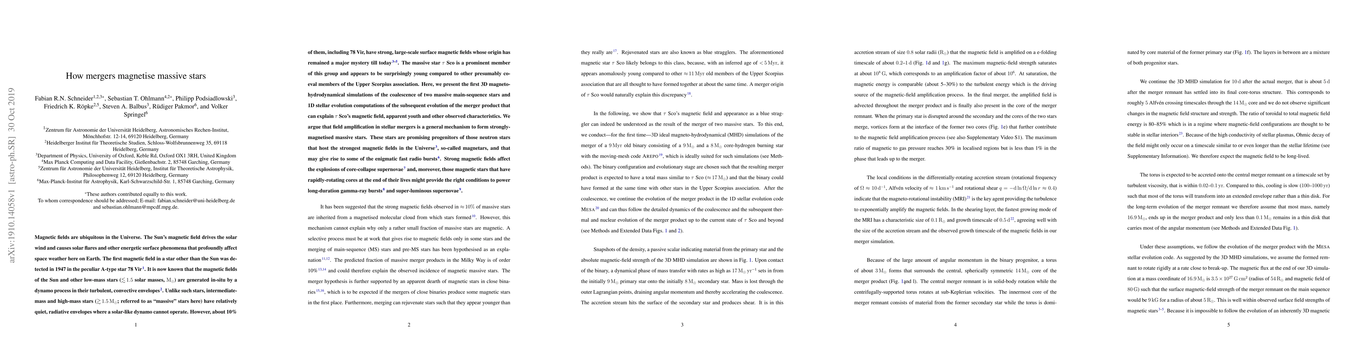 Magnetic fields are ubiquitous in the Universe. The Sun's magnetic field drives the solar wind and causes solar flares and other energetic surface phenomena that profoundly affect space weather here on Earth. The first magnetic field in a star other than the Sun was detected in 1947 in the peculiar A-type star 78 Vir. It is now known that the magnetic fields of the Sun and other low-mass stars (<1.5 solar masses) are generated in-situ by a dynamo process in their turbulent, convective envelopes. Unlike such stars, intermediate-mass and high-mass stars (>1.5 solar masses; referred to as "massive" stars here) have relatively quiet, radiative envelopes where a solar-like dynamo cannot operate. However, about 10% of them, including 78 Vir, have strong, large-scale surface magnetic fields whose origin has remained a major mystery. The massive star $\tau$ Sco is a prominent member of this group and appears to be surprisingly young compared to other presumably coeval members of the Upper Scorpius association. Here, we present the first 3D magneto-hydrodynamical simulations of the coalescence of two massive main-sequence stars and 1D stellar evolution computations of the subsequent evolution of the merger product that can explain $\tau$ Sco's magnetic field, apparent youth and other observed characteristics. We argue that field amplification in stellar mergers is a general mechanism to form strongly-magnetised massive stars. These stars are promising progenitors of those neutron stars that host the strongest magnetic fields in the Universe, so-called magnetars, and that may give rise to some of the enigmatic fast radio bursts. Strong magnetic fields affect the explosions of core-collapse supernovae and, moreover, those magnetic stars that have rapidly-rotating cores at the end of their lives might provide the right conditions to power long-duration gamma-ray bursts and super-luminous supernovae.
