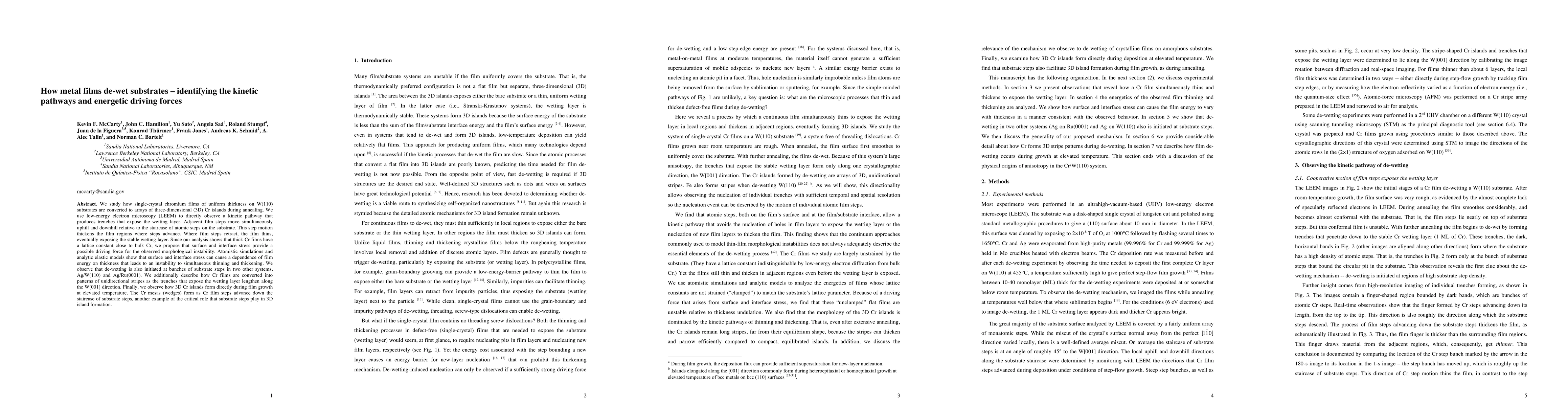 We study how single-crystal chromium films of uniform thickness on W(110) substrates are converted to arrays of three-dimensional (3D) Cr islands during annealing. We use low-energy electron microscopy (LEEM) to directly observe a kinetic pathway that produces trenches that expose the wetting layer. Adjacent film steps move simultaneously uphill and downhill relative to the staircase of atomic steps on the substrate. This step motion thickens the film regions where steps advance. Where film steps retract, the film thins, eventually exposing the stable wetting layer. Since our analysis shows that thick Cr films have a lattice constant close to bulk Cr, we propose that surface and interface stress provide a possible driving force for the observed morphological instability. Atomistic simulations and analytic elastic models show that surface and interface stress can cause a dependence of film energy on thickness that leads to an instability to simultaneous thinning and thickening. We observe that de-wetting is also initiated at bunches of substrate steps in two other systems, Ag/W(110) and Ag/Ru(0001). We additionally describe how Cr films are converted into patterns of unidirectional stripes as the trenches that expose the wetting layer lengthen along the W[001] direction. Finally, we observe how 3D Cr islands form directly during film growth at elevated temperature. The Cr mesas (wedges) form as Cr film steps advance down the staircase of substrate steps, another example of the critical role that substrate steps play in 3D island formation.