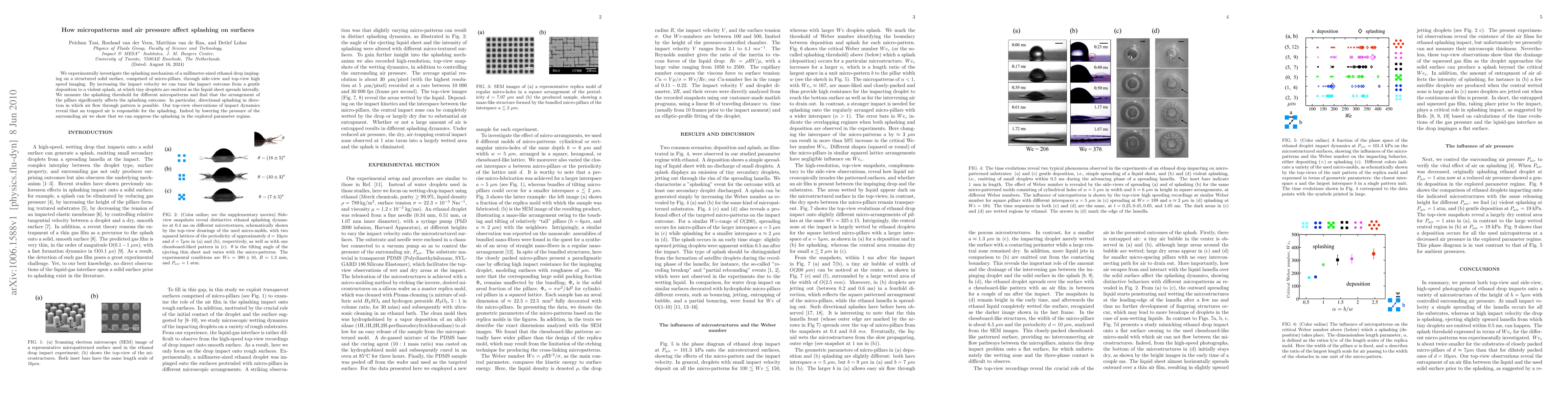 This study experimentally examines how micropatterns and air pressure influence the splashing of ethanol drops on structured surfaces with micro-pillars. The research finds that the arrangement of micro-pillars significantly affects splashing, with directional splashing occurring when air can flow through the pattern, and that reduced surrounding air pressure can suppress splashing.