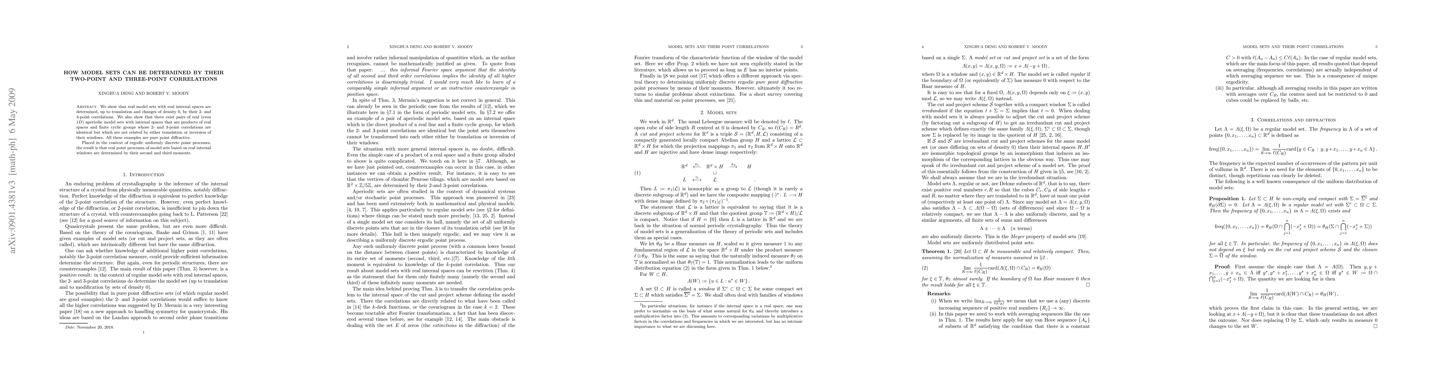 Real model sets are determined by their two-point and three-point correlations, which can also identify pairs of unrelated model sets with identical correlations, highlighting the uniqueness of real model sets in ergodic uniformly discrete point processes.