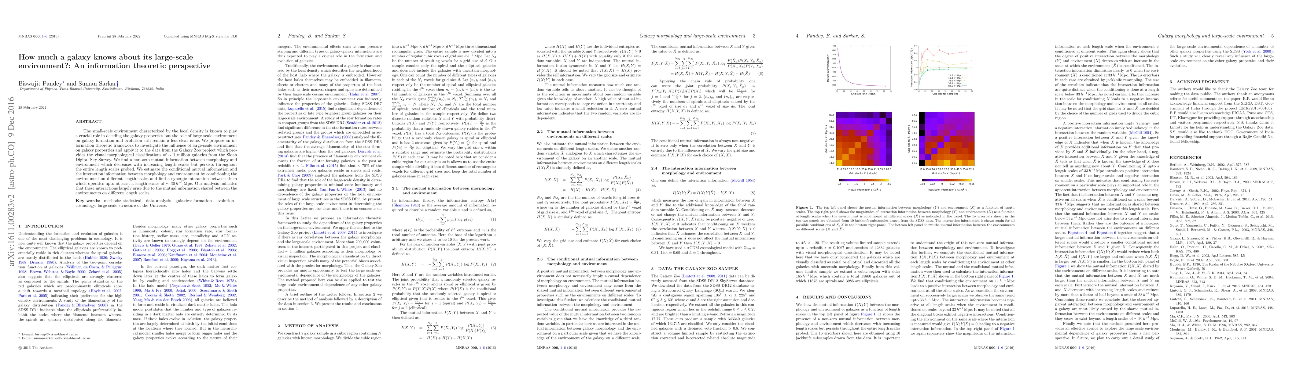This paper uses an information theoretic framework to explore how large-scale environments influence galaxy properties, finding a persistent, albeit decreasing, mutual information between galaxy morphology and environment across various length scales. The study concludes that large-scale environments significantly affect galaxy formation and evolution, with interactions observable up to scales of approximately 30 $h^{-1}$ Mpc.