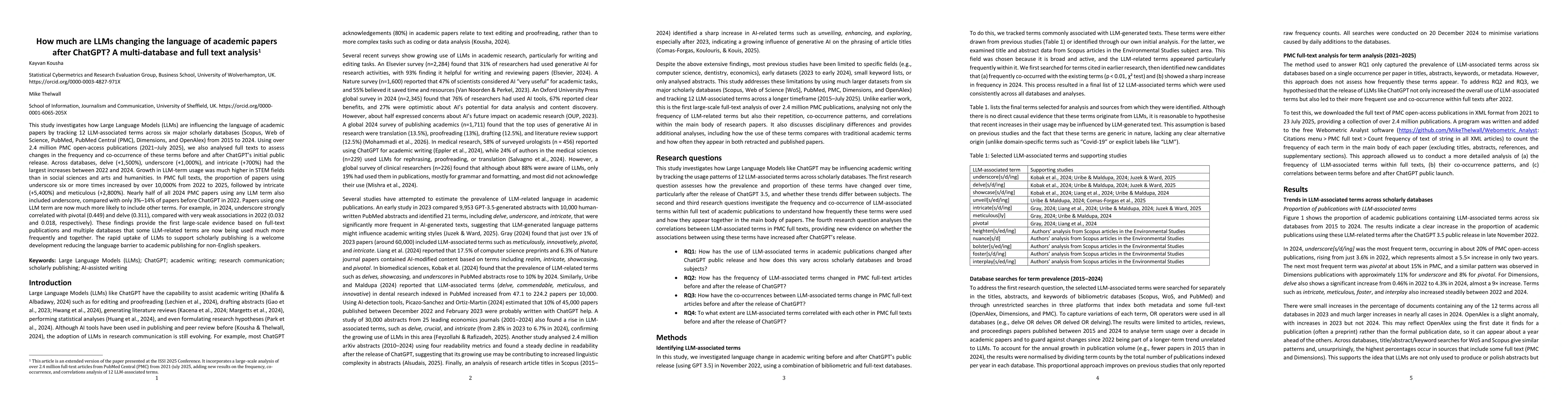 This study investigates how Large Language Models (LLMs) are influencing the language of academic papers by tracking 12 LLM-associated terms across six major scholarly databases (Scopus, Web of Science, PubMed, PubMed Central (PMC), Dimensions, and OpenAlex) from 2015 to 2024. Using over 2.4 million PMC open-access publications (2021-July 2025), we also analysed full texts to assess changes in the frequency and co-occurrence of these terms before and after ChatGPT's initial public release. Across databases, delve (+1,500%), underscore (+1,000%), and intricate (+700%) had the largest increases between 2022 and 2024. Growth in LLM-term usage was much higher in STEM fields than in social sciences and arts and humanities. In PMC full texts, the proportion of papers using underscore six or more times increased by over 10,000% from 2022 to 2025, followed by intricate (+5,400%) and meticulous (+2,800%). Nearly half of all 2024 PMC papers using any LLM term also included underscore, compared with only 3%-14% of papers before ChatGPT in 2022. Papers using one LLM term are now much more likely to include other terms. For example, in 2024, underscore strongly correlated with pivotal (0.449) and delve (0.311), compared with very weak associations in 2022 (0.032 and 0.018, respectively). These findings provide the first large-scale evidence based on full-text publications and multiple databases that some LLM-related terms are now being used much more frequently and together. The rapid uptake of LLMs to support scholarly publishing is a welcome development reducing the language barrier to academic publishing for non-English speakers.