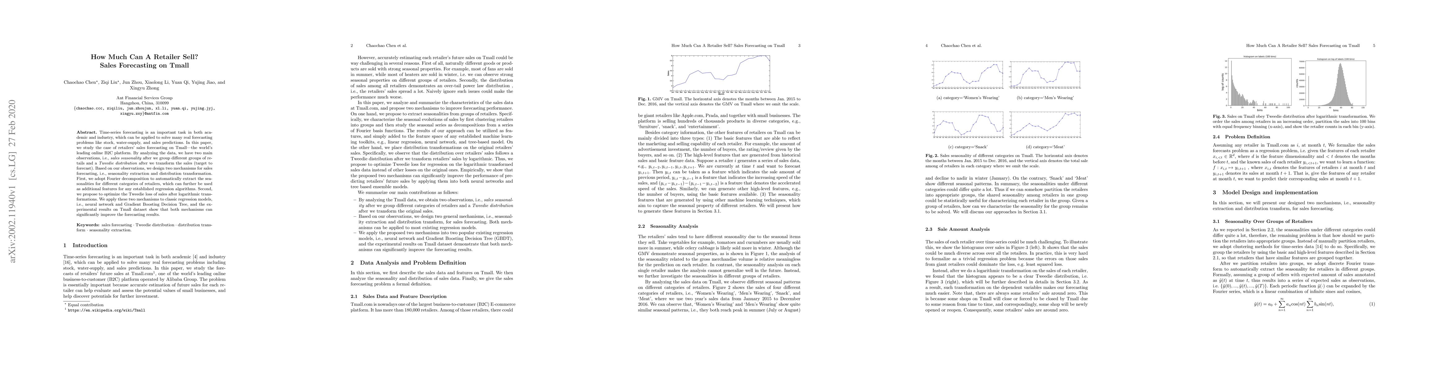 This paper investigates sales forecasting for retailers on Tmall, employing time-series analysis to identify seasonality and a Tweedie distribution in sales data. It proposes two forecasting mechanisms: Fourier decomposition for seasonality extraction and Tweedie loss optimization post-logarithmic transformation, which significantly enhance the accuracy of sales predictions using neural networks and Gradient Boosting Decision Trees.