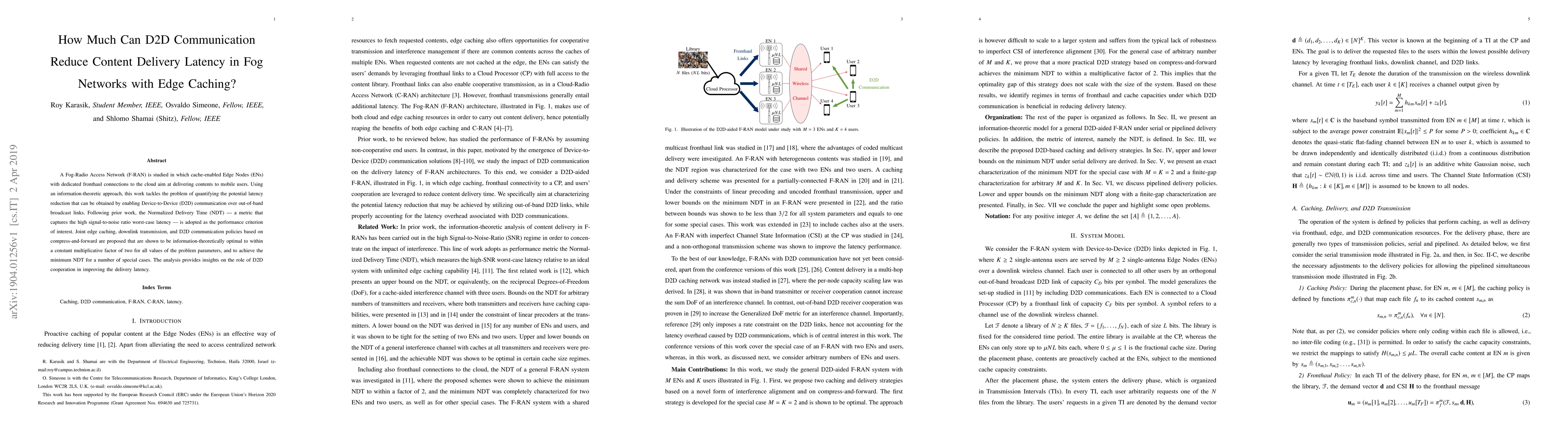This paper investigates how Device-to-Device (D2D) communication can reduce content delivery latency in Fog-Radio Access Networks (F-RAN) with edge caching. It proposes optimal caching, transmission, and D2D communication strategies that achieve near-optimal latency reduction, quantified by the Normalized Delivery Time (NDT).