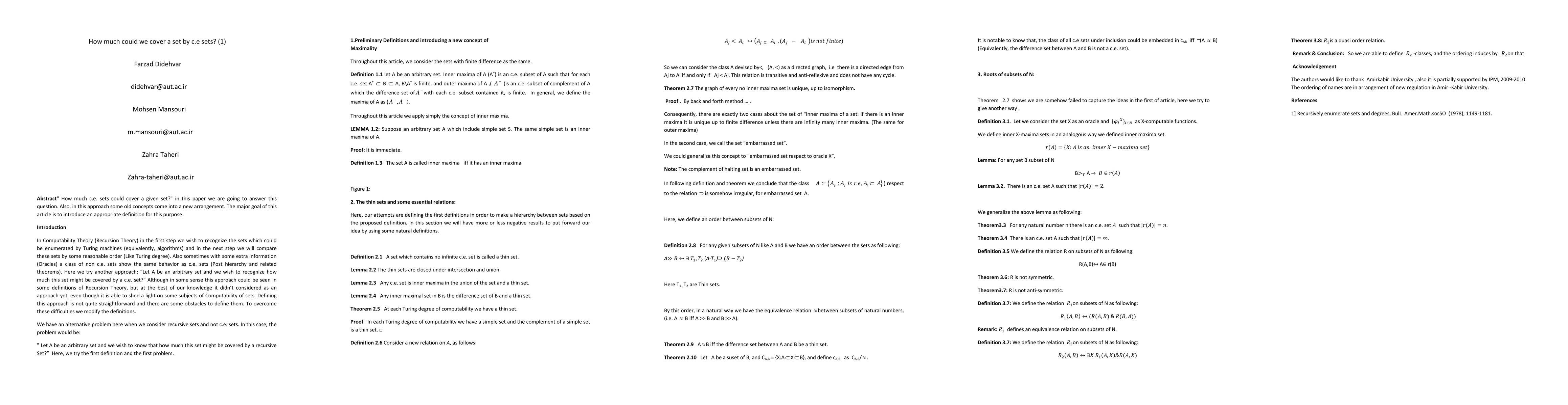 "How much c.e. sets could cover a given set?" in this paper we are going to answer this question. Also, in this approach some old concepts come into a new arrangement. The major goal of this article is to introduce an appropriate definition for this purpose. Introduction In Computability Theory (Recursion Theory) in the first step we wish to recognize the sets which could be enumerated by Turing machines (equivalently, algorithms) and in the next step we will compare these sets by some reasonable order (Like Turing degree). Also sometimes with some extra information (Oracles) a class of non c.e. sets show the same behavior as c.e. sets (Post hierarchy and related theorems). Here we try another approach: "Let A be an arbitrary set and we wish to recognize how much this set might be covered by a c.e. set?" Although in some sense this approach could be seen in some definitions of Recursion Theory, but at the best of our knowledge it didn't considered as an approach yet, even though it is able to shed a light on some subjects of Computability of sets. Defining this approach is not quite straightforward and there are some obstacles to define them. To overcome these difficulties we modify the definitions. We have an alternative problem here when we consider recursive sets and not c.e. sets. In this case, the problem would be: "Let A be an arbitrary set and we wish to know that how much this set might be covered by a recursive Set?" Here, we try the first definition and the first problem.