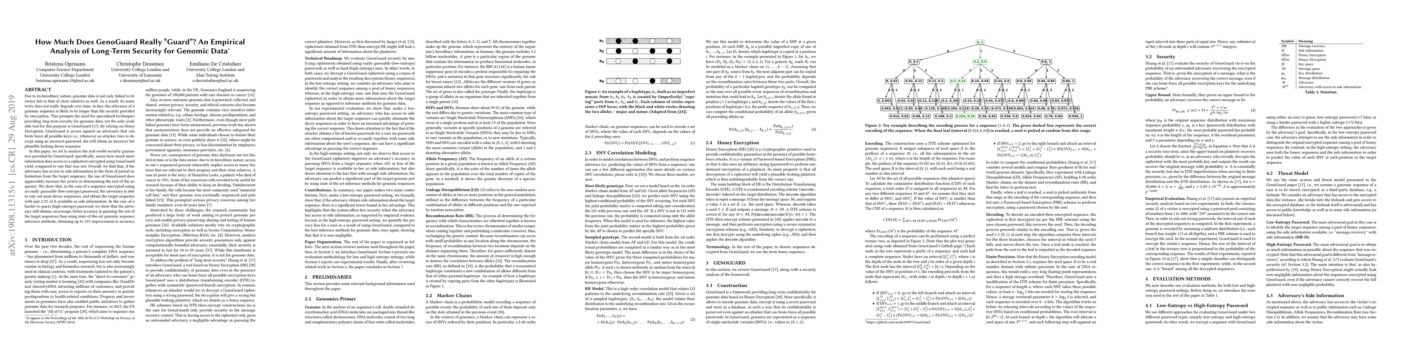 Due to its hereditary nature, genomic data is not only linked to its owner but to that of close relatives as well. As a result, its sensitivity does not really degrade over time; in fact, the relevance of a genomic sequence is likely to be longer than the security provided by encryption. This prompts the need for specialized techniques providing long-term security for genomic data, yet the only available tool for this purpose is GenoGuard (Huang et al., 2015). By relying on Honey Encryption, GenoGuard is secure against an adversary that can brute force all possible keys; i.e., whenever an attacker tries to decrypt using an incorrect password, she will obtain an incorrect but plausible looking decoy sequence. In this paper, we set to analyze the real-world security guarantees provided by GenoGuard; specifically, assess how much more information does access to a ciphertext encrypted using GenoGuard yield, compared to one that was not. Overall, we find that, if the adversary has access to side information in the form of partial information from the target sequence, the use of GenoGuard does appreciably increase her power in determining the rest of the sequence. We show that, in the case of a sequence encrypted using an easily guessable (low-entropy) password, the adversary is able to rule out most decoy sequences, and obtain the target sequence with just 2.5\% of it available as side information. In the case of a harder-to-guess (high-entropy) password, we show that the adversary still obtains, on average, better accuracy in guessing the rest of the target sequences than using state-of-the-art genomic sequence inference methods, obtaining up to 15% improvement in accuracy.