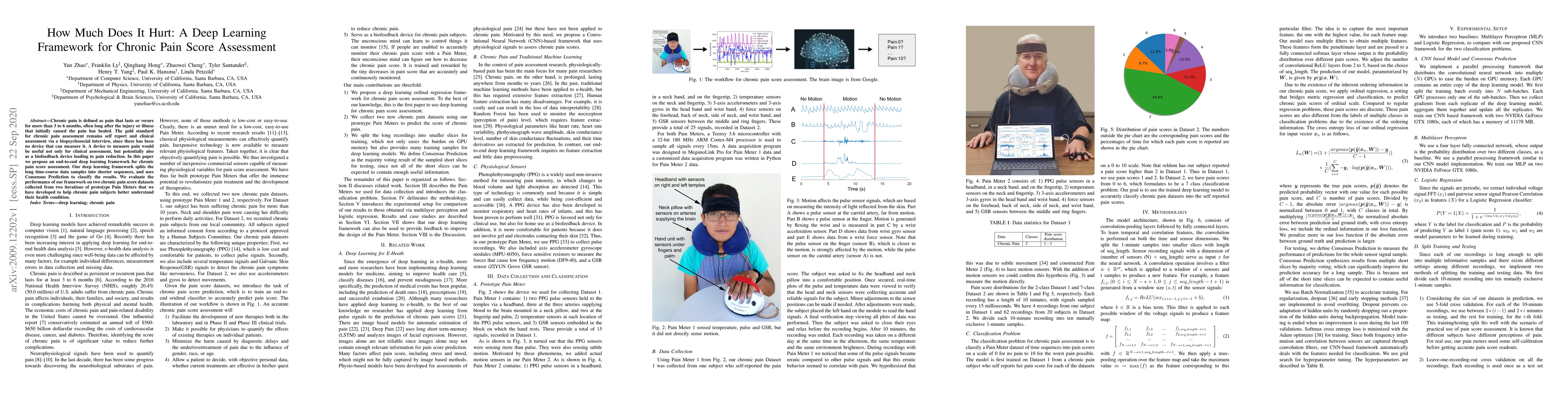 Chronic pain is defined as pain that lasts or recurs for more than 3 to 6 months, often long after the injury or illness that initially caused the pain has healed. The "gold standard" for chronic pain assessment remains self report and clinical assessment via a biopsychosocial interview, since there has been no device that can measure it. A device to measure pain would be useful not only for clinical assessment, but potentially also as a biofeedback device leading to pain reduction. In this paper we propose an end-to-end deep learning framework for chronic pain score assessment. Our deep learning framework splits the long time-course data samples into shorter sequences, and uses Consensus Prediction to classify the results. We evaluate the performance of our framework on two chronic pain score datasets collected from two iterations of prototype Pain Meters that we have developed to help chronic pain subjects better understand their health condition.