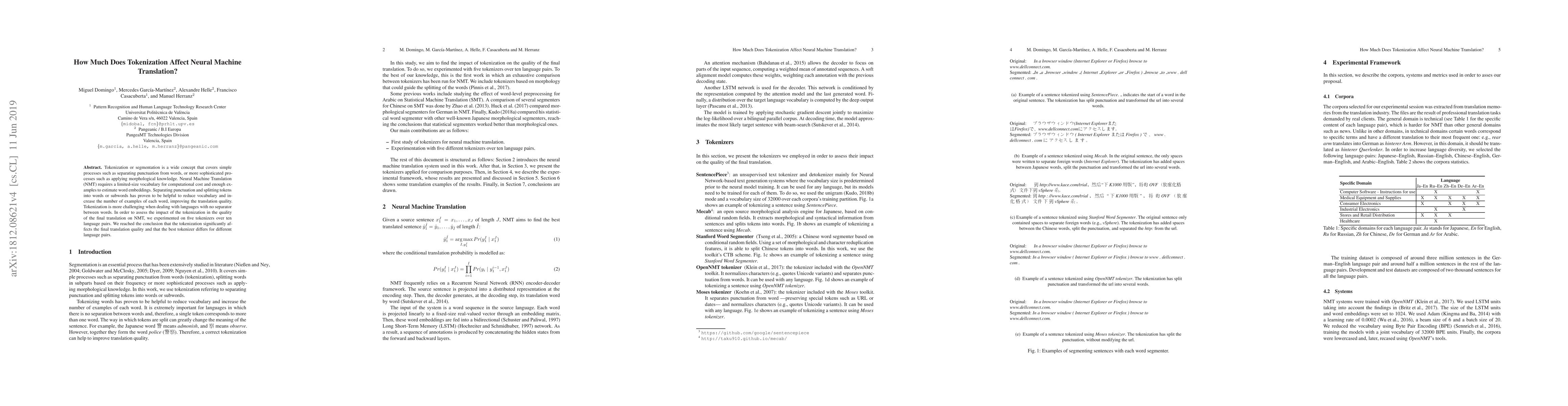 The research experimented with five tokenizers on ten language pairs, using NMT systems trained with OpenNMT, LSTM units, and Byte Pair Encoding (BPE) for vocabulary reduction. Corpora were extracted from translation memories in the translation industry, covering technical domains such as computer software, medical equipment, consumer electronics, industrial electronics, stores and retail distribution, and healthcare.