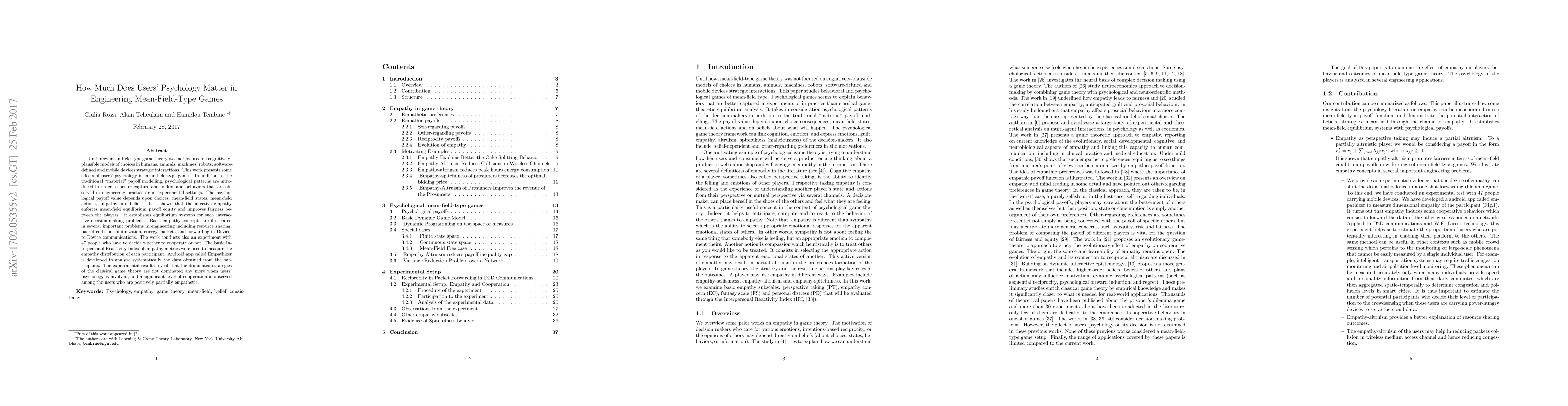 Until now mean-field-type game theory was not focused on cognitively-plausible models of choices in humans, animals, machines, robots, software-defined and mobile devices strategic interactions. This work presents some effects of users' psychology in mean-field-type games. In addition to the traditional "material" payoff modelling, psychological patterns are introduced in order to better capture and understand behaviors that are observed in engineering practice or in experimental settings. The psychological payoff value depends upon choices, mean-field states, mean-field actions, empathy and beliefs. It is shown that the affective empathy enforces mean-field equilibrium payoff equity and improves fairness between the players. It establishes equilibrium systems for such interactive decision-making problems. Basic empathy concepts are illustrated in several important problems in engineering including resource sharing, packet collision minimization, energy markets, and forwarding in Device-to-Device communications. The work conducts also an experiment with 47 people who have to decide whether to cooperate or not. The basic Interpersonal Reactivity Index of empathy metrics were used to measure the empathy distribution of each participant. Android app called Empathizer is developed to analyze systematically the data obtained from the participants. The experimental results reveal that the dominated strategies of the classical game theory are not dominated any more when users' psychology is involved, and a significant level of cooperation is observed among the users who are positively partially empathetic.