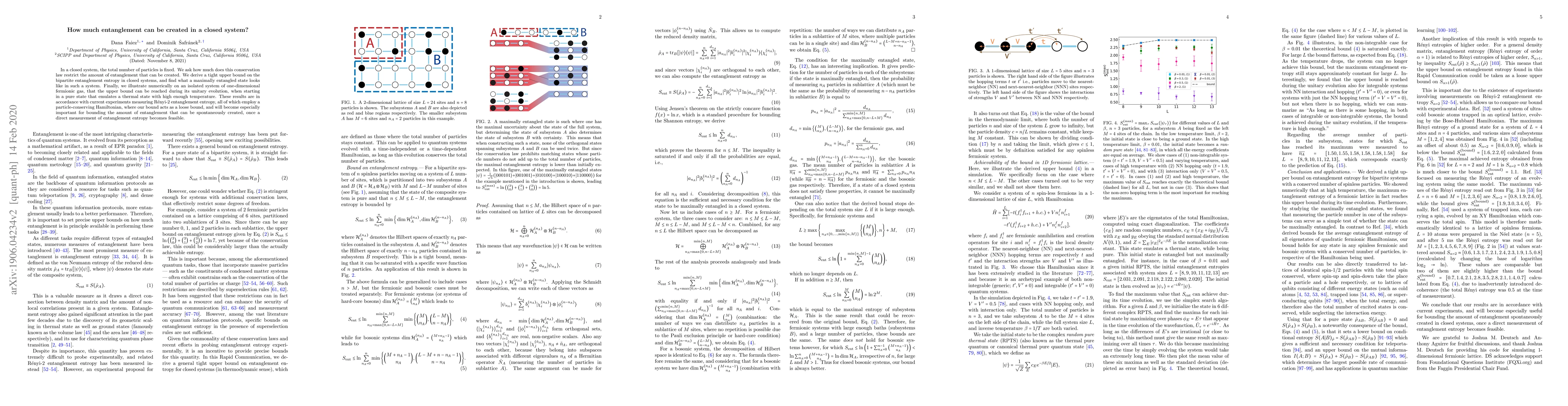 This paper derives a tight upper bound on bipartite entanglement entropy in closed systems, demonstrating that conservation laws limit the amount of entanglement. It shows that this bound can be reached in a one-dimensional fermionic gas, and suggests its importance for future experiments measuring entanglement entropy.