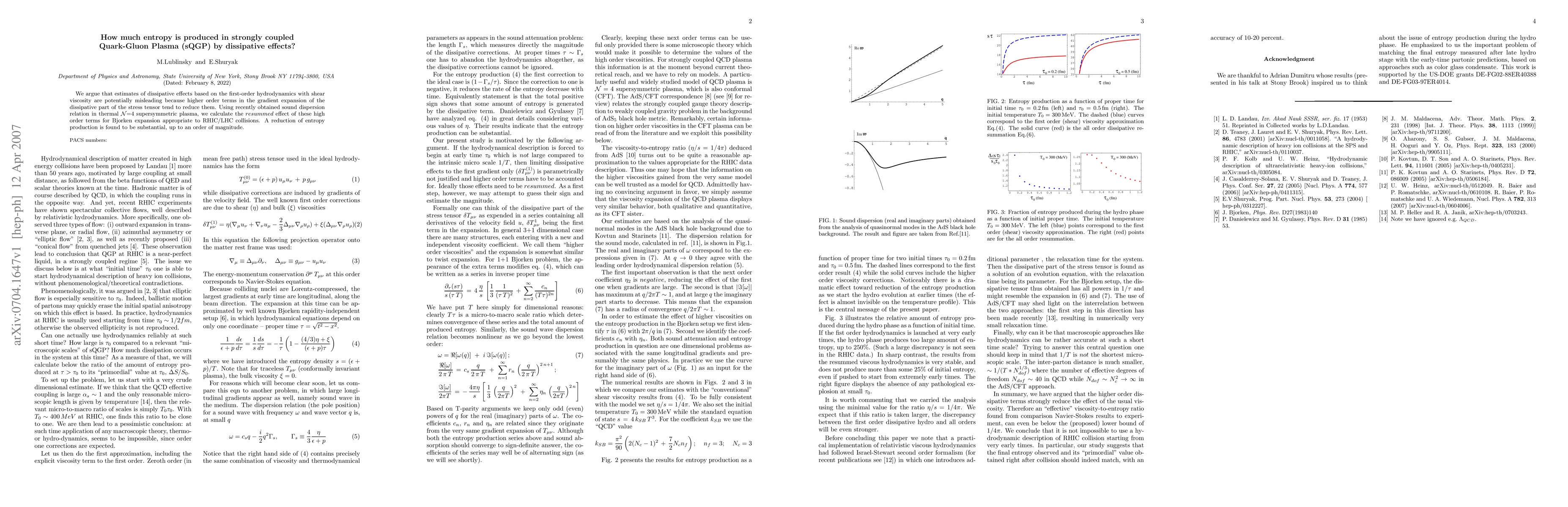 We argue that estimates of dissipative effects based on the first-order hydrodynamics with shear viscosity are potentially misleading because higher order terms in the gradient expansion of the dissipative part of the stress tensor tend to reduce them. Using recently obtained sound dispersion relation in thermal $\cal N$=4 supersymmetric plasma, we calculate the $resummed$ effect of these high order terms for Bjorken expansion appropriate to RHIC/LHC collisions. A reduction of entropy production is found to be substantial, up to an order of magnitude.