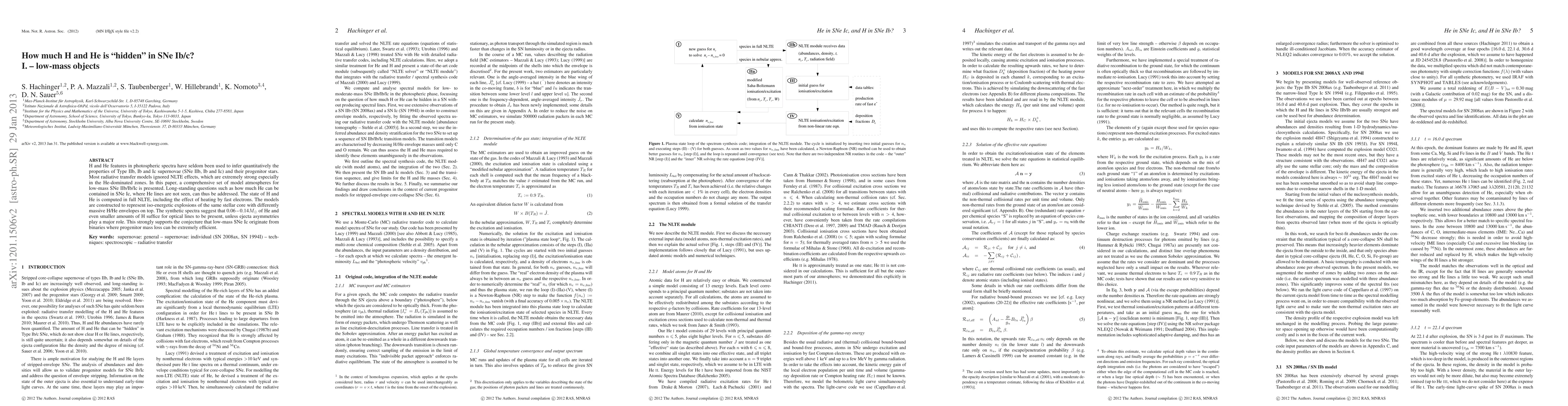 H and He features in photospheric spectra have seldom been used to infer quantitatively the properties of Type IIb, Ib and Ic supernovae (SNe IIb, Ib and Ic) and their progenitor stars. Most radiative transfer models ignored NLTE effects, which are extremely strong especially in the He-dominated zones. In this paper, a comprehensive set of model atmospheres for low-mass SNe IIb/Ib/Ic is presented. Long-standing questions such as how much He can be contained in SNe Ic, where He lines are not seen, can thus be addressed. The state of H and He is computed in full NLTE, including the effect of heating by fast electrons. The models are constructed to represent iso-energetic explosions of the same stellar core with differently massive H/He envelopes on top. The synthetic spectra suggest that 0.06 - 0.14 M_sun of He and even smaller amounts of H suffice for optical lines to be present, unless ejecta asymmetries play a major role. This strongly supports the conjecture that low-mass SNe Ic originate from binaries where progenitor mass loss can be extremely efficient.
