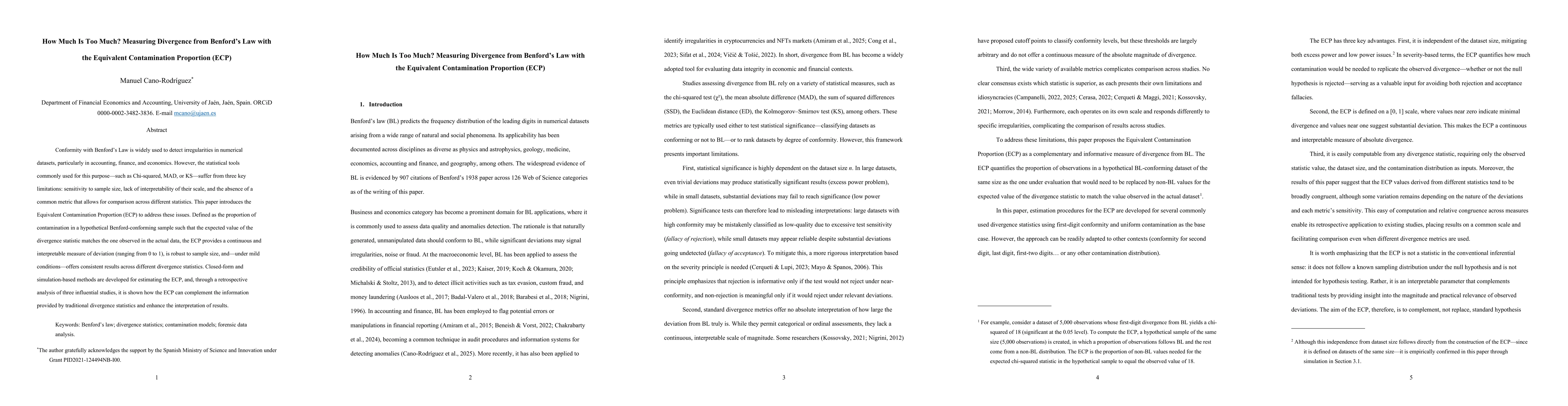 Conformity with Benford's Law is widely used to detect irregularities in numerical datasets, particularly in accounting, finance, and economics. However, the statistical tools commonly used for this purpose (such as Chi-squared, MAD, or KS) suffer from three key limitations: sensitivity to sample size, lack of interpretability of their scale, and the absence of a common metric that allows for comparison across different statistics. This paper introduces the Equivalent Contamination Proportion (ECP) to address these issues. Defined as the proportion of contamination in a hypothetical Benford-conforming sample such that the expected value of the divergence statistic matches the one observed in the actual data, the ECP provides a continuous and interpretable measure of deviation (ranging from 0 to 1), is robust to sample size, and offers consistent results across different divergence statistics under mild conditions. Closed-form and simulation-based methods are developed for estimating the ECP, and, through a retrospective analysis of three influential studies, it is shown how the ECP can complement the information provided by traditional divergence statistics and enhance the interpretation of results.